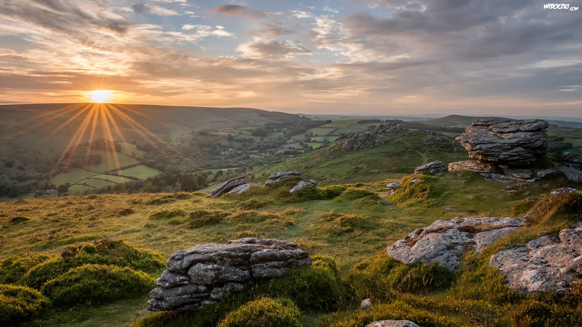 Zdjęcia, Wschód słońca, Promienie słońca, Wzgórze, Kamienie, Skały