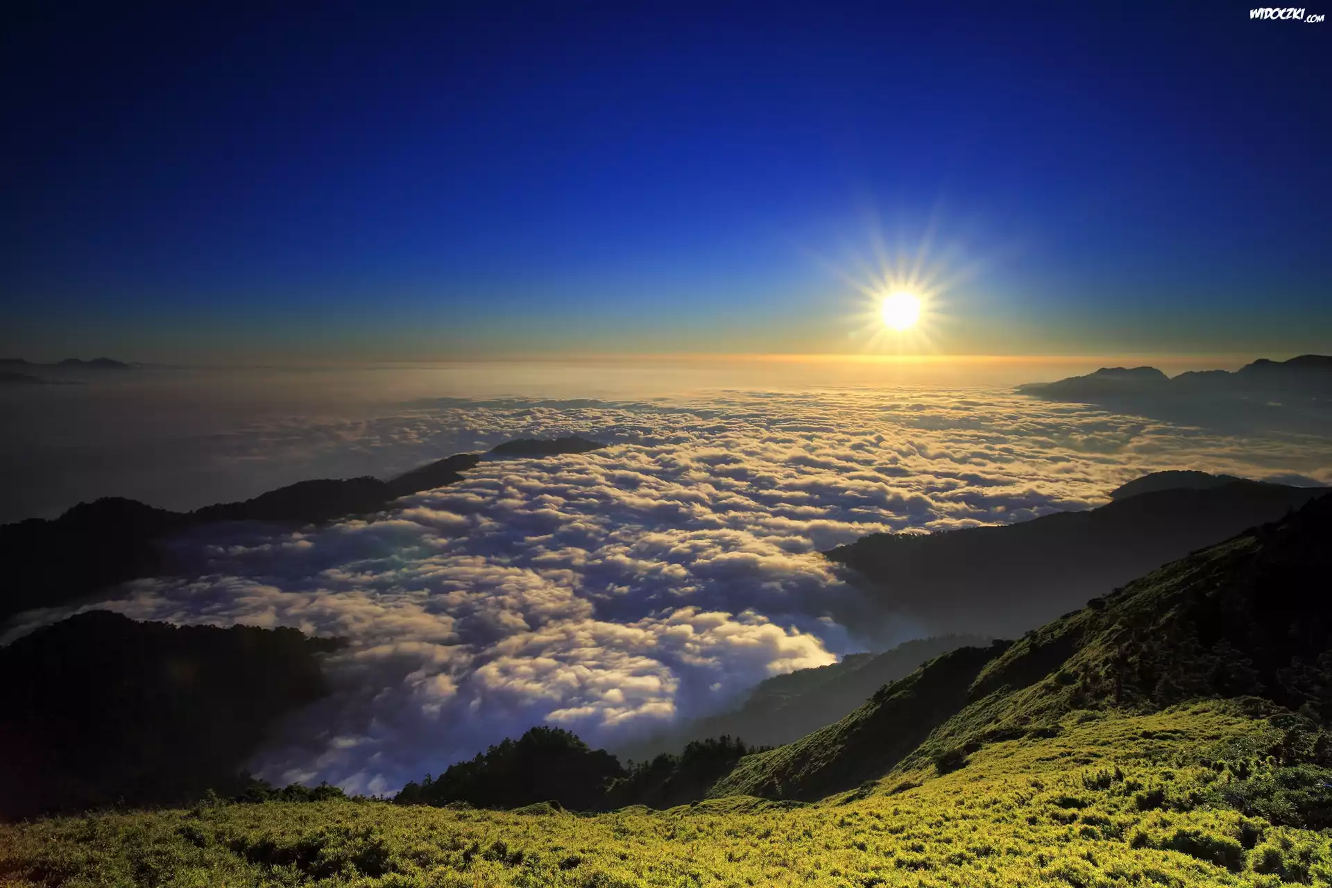 Zdjęcia, Wschód Słońca, Chmury, Niebo, Góry, Promienie słońca