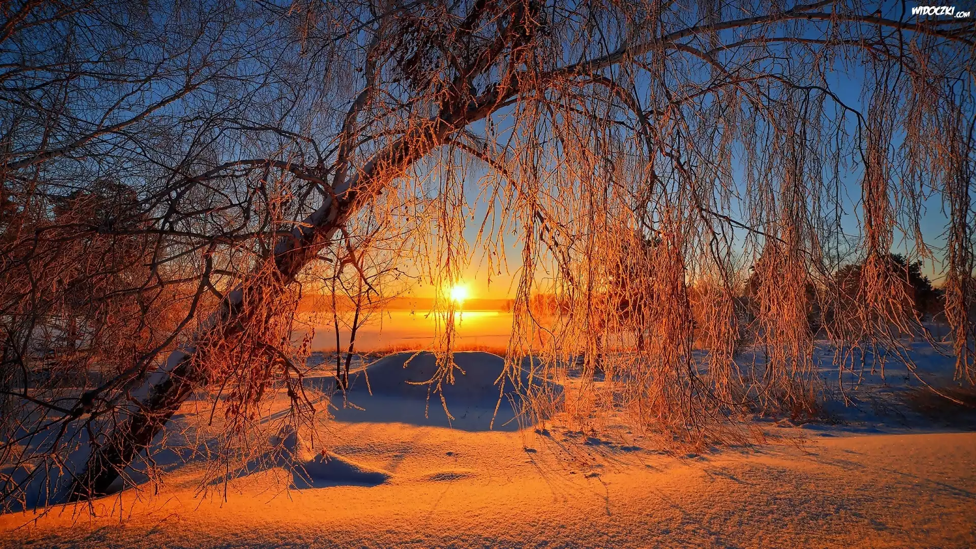 Zdjęcia, Wschód, Słońca, Pochyłe, Drzewo, Śnieg, Blask, Szron
