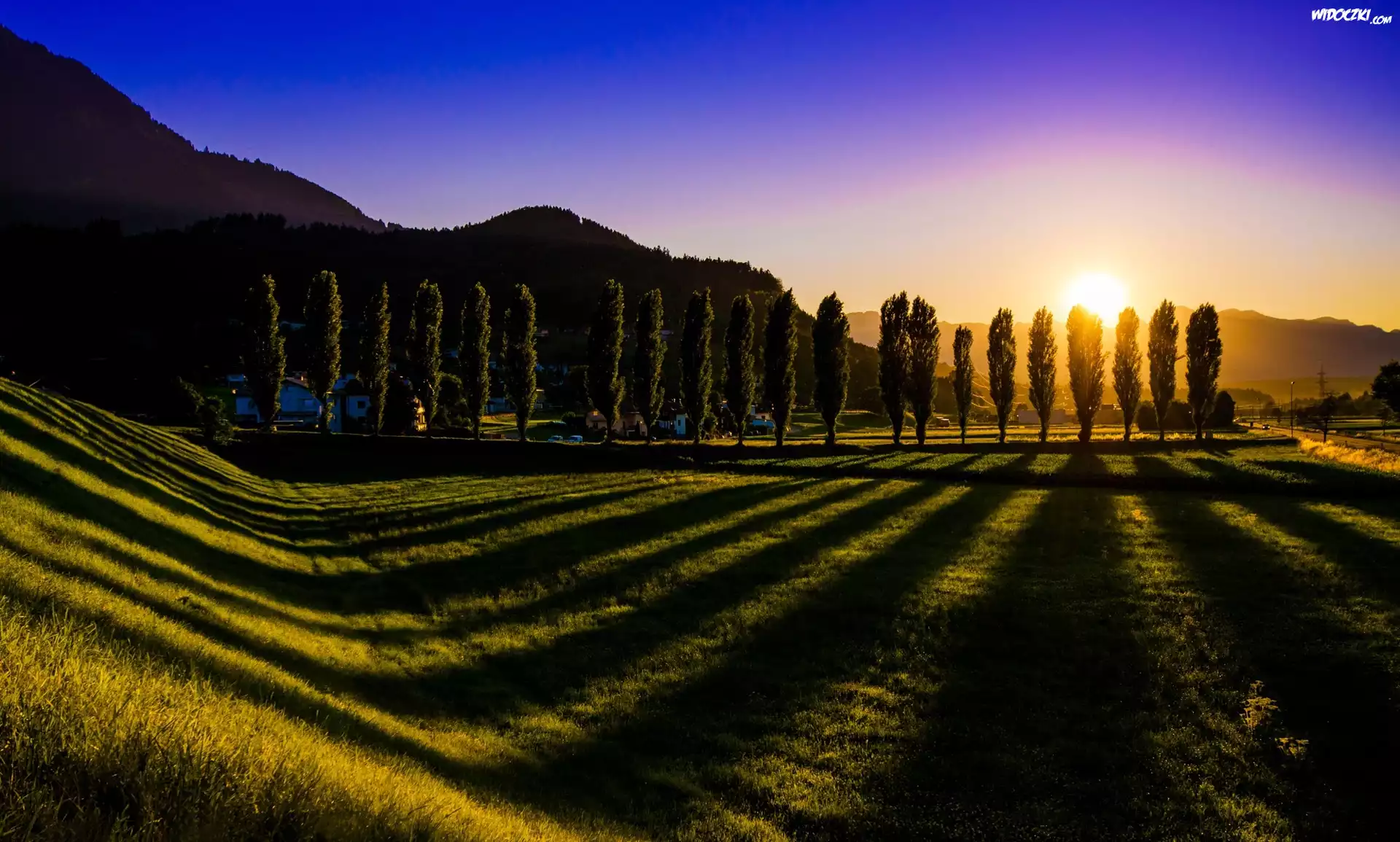Zdjęcia, Wschód Słońca, Drzewa, Cienie, Domy, Wieś, Wzgórza