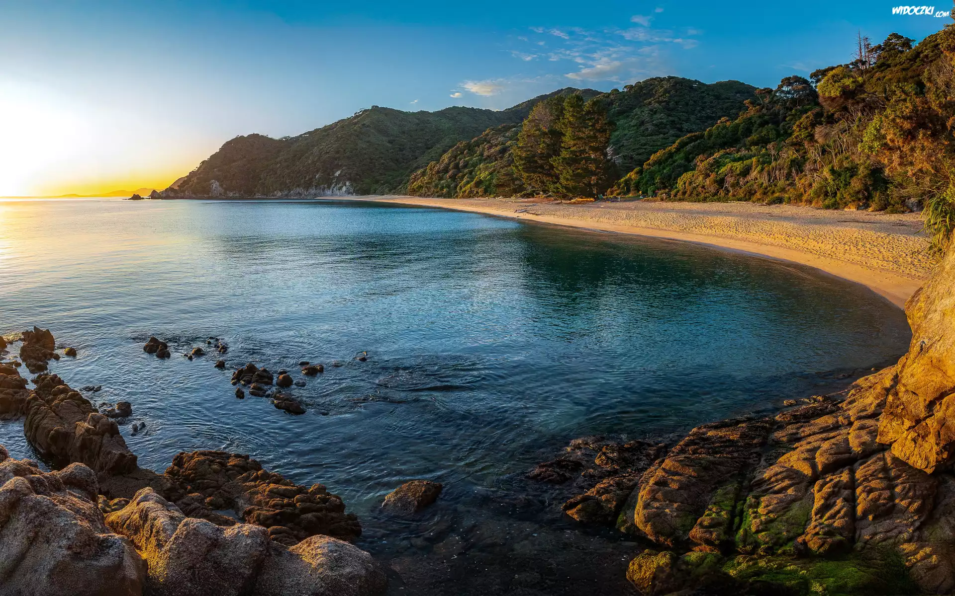 Morze, Góry, Wybrzeże, Skały, Drzewa, Plaża, Wschód słońca