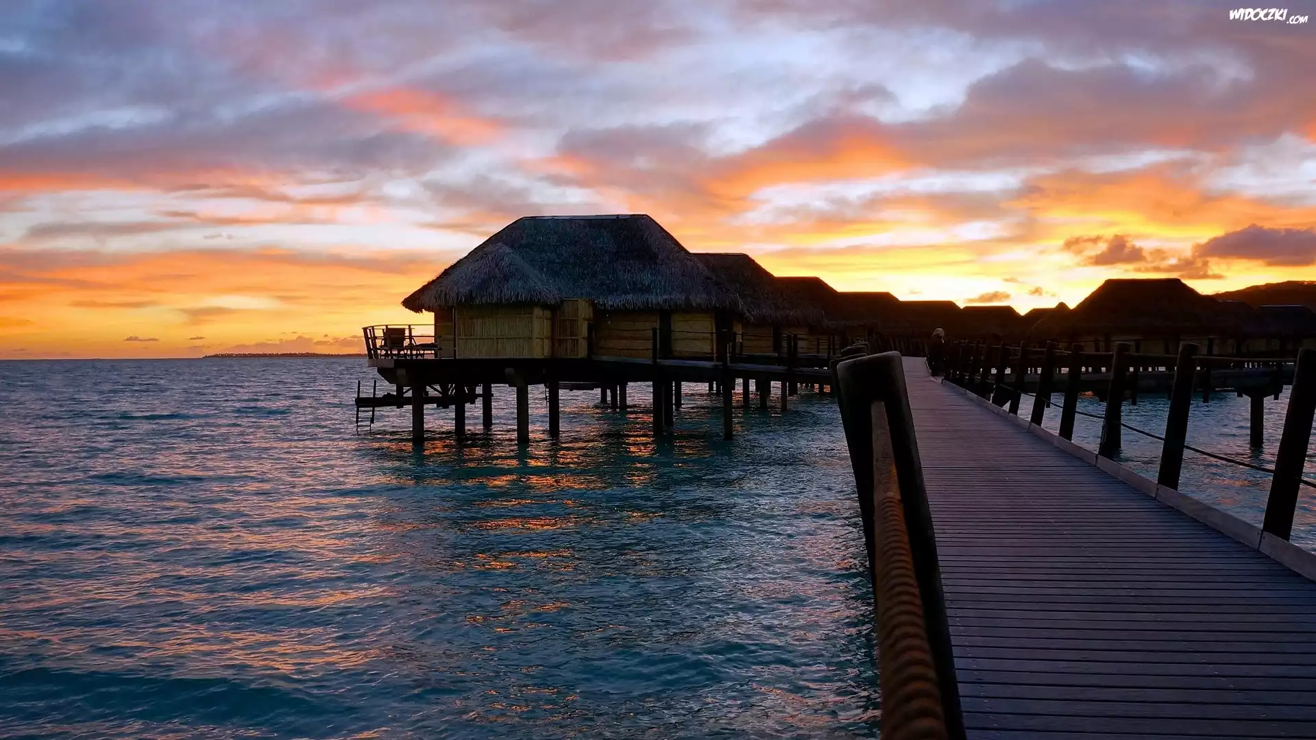Zdjęcia, Polinezja Francuska, Wyspa Motu Tautau, Morze, Molo, Zachód słońca