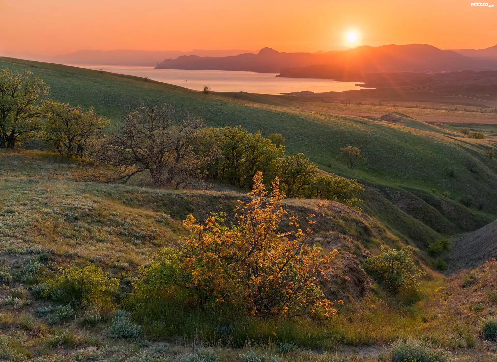 Zdjęcia, Rosja, Krym, Morze Czarne, Wzgórza, Przylądek Meganom, Drzewa, Promienie słońca
