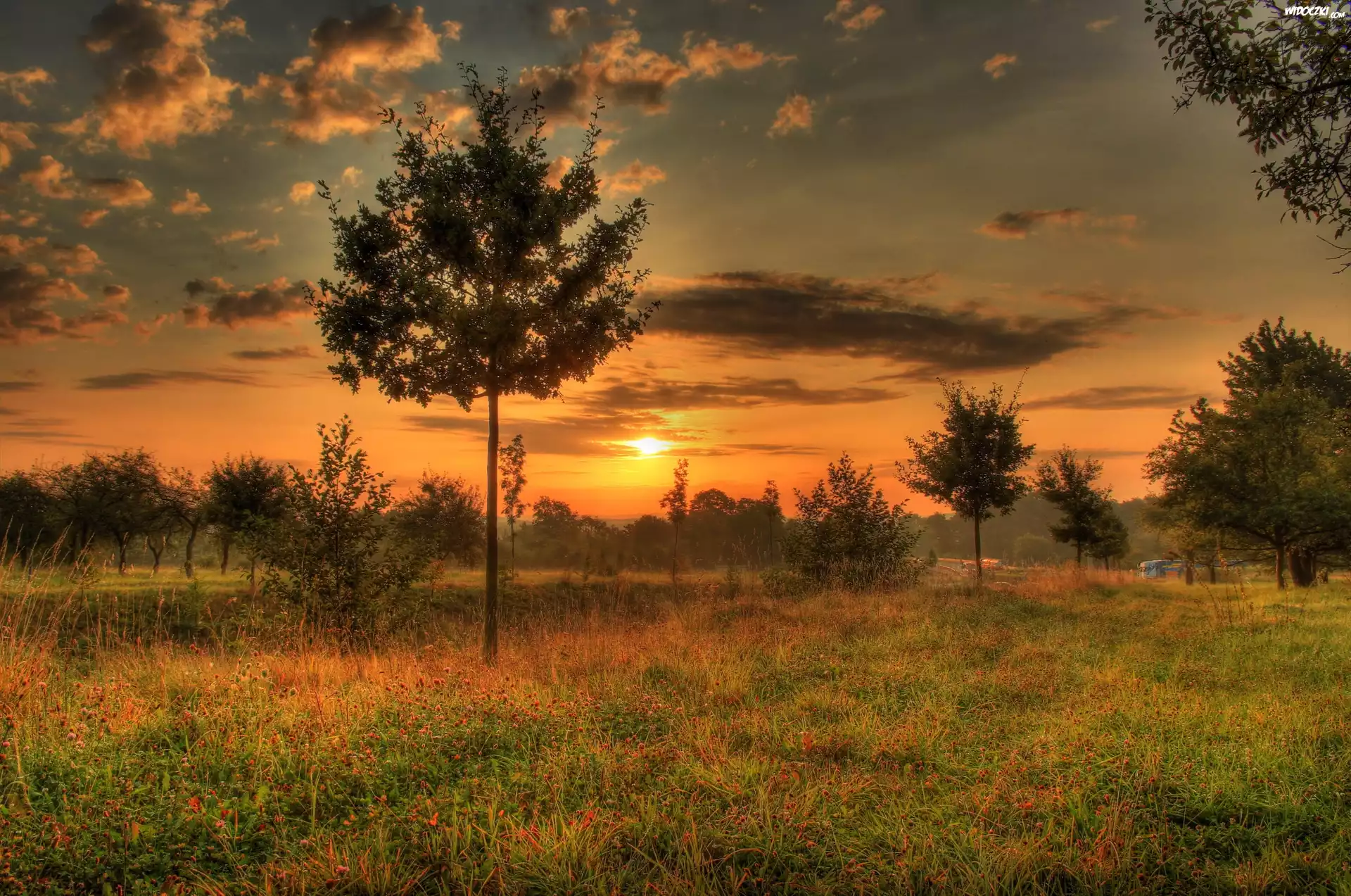 Zdjęcia, Łąka, Zachód, Słońca, Drzewka