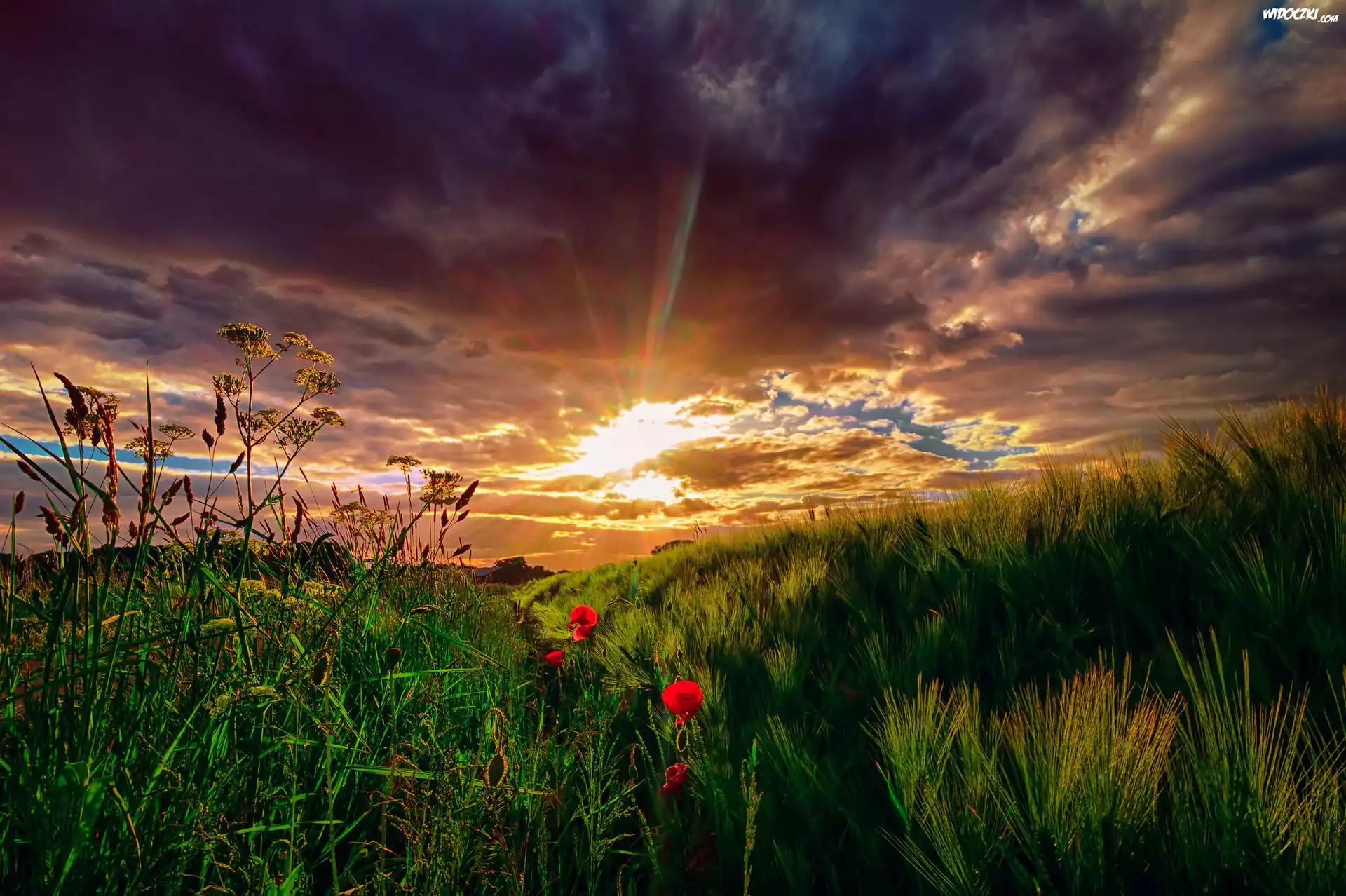 Łąka, Zachód, Słońca, Maki