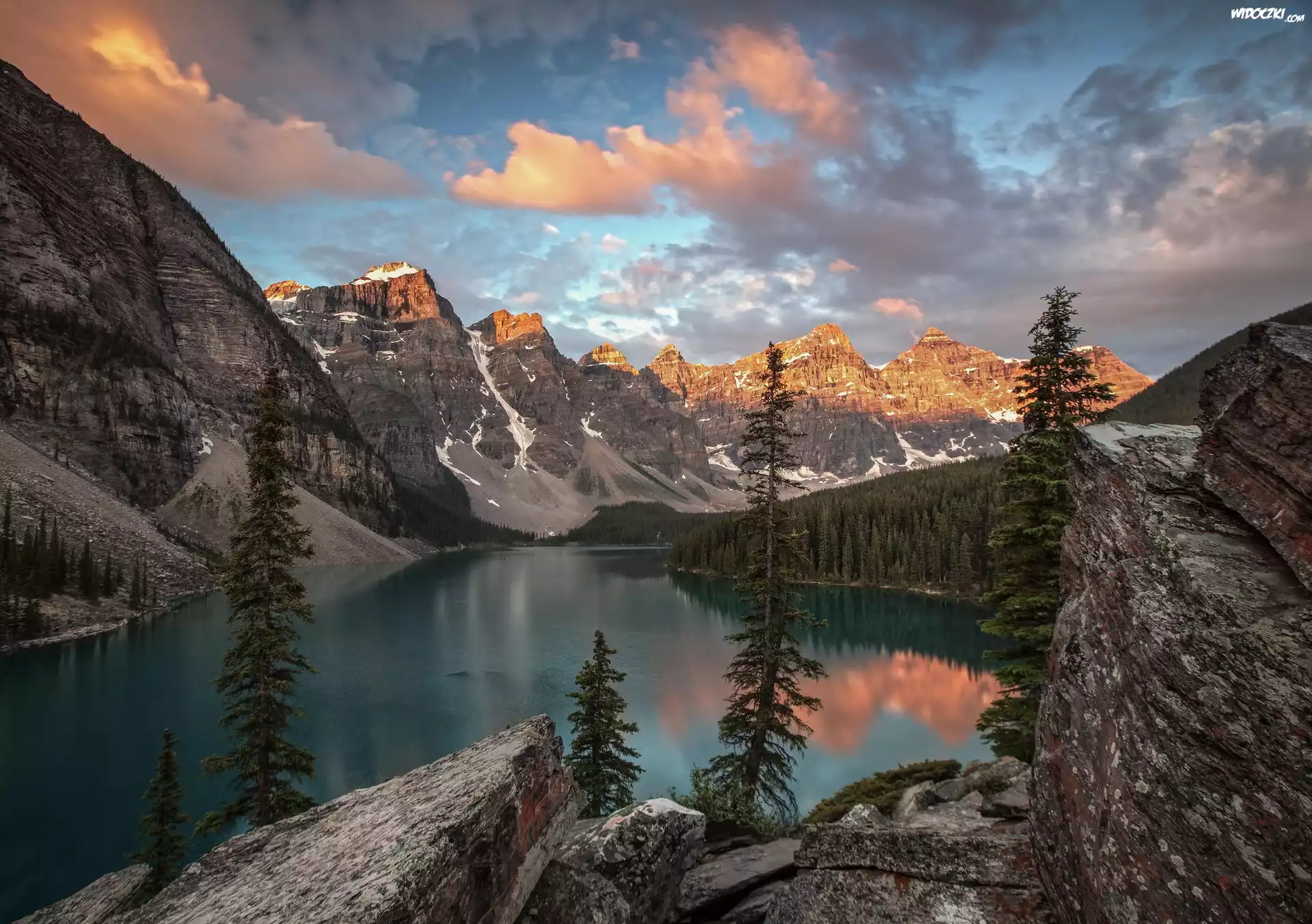 Zachod, Slonca, Niebo, Lasy, Jezioro, Gory, Chmury