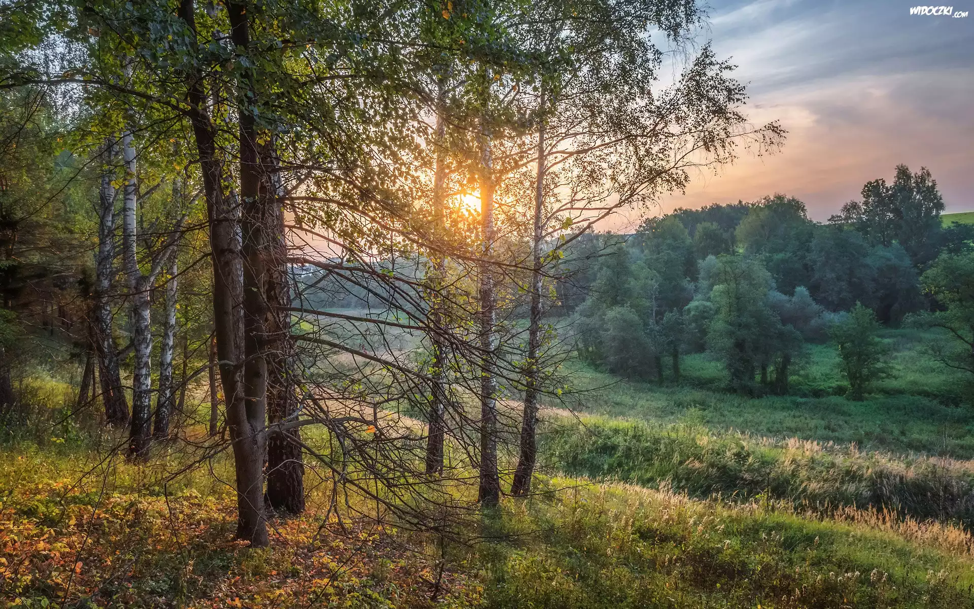 Zachód słońca, Las, Drzewa, Mgła, Roślinność, Chmury