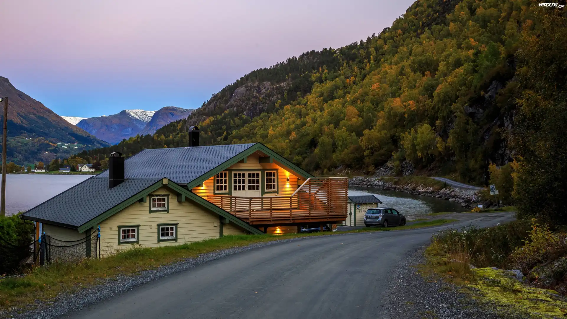 Zdjęcia, Zachód słońca, Droga, Domy, Góry, Jezioro, Drzewa