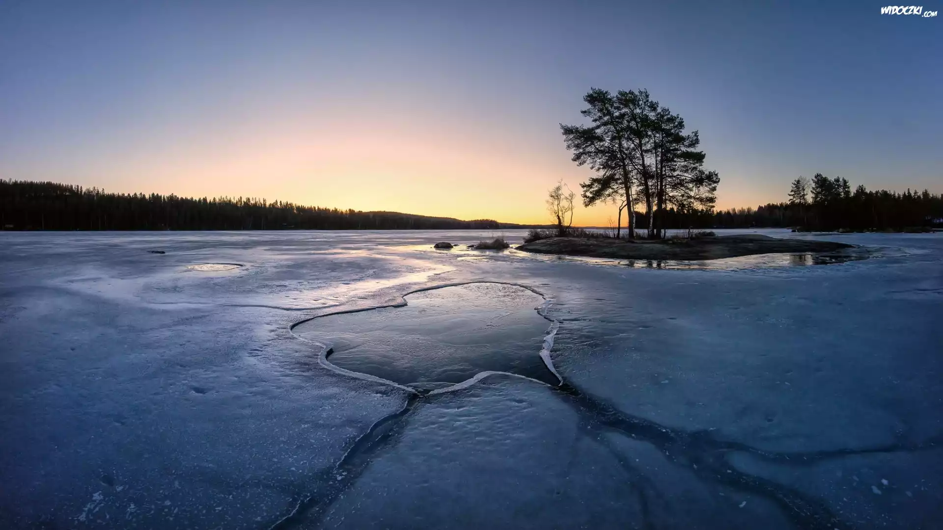 Zdjęcia, Zachód słońca, Zima, Lód, Jezioro, Wysepka, Drzewa