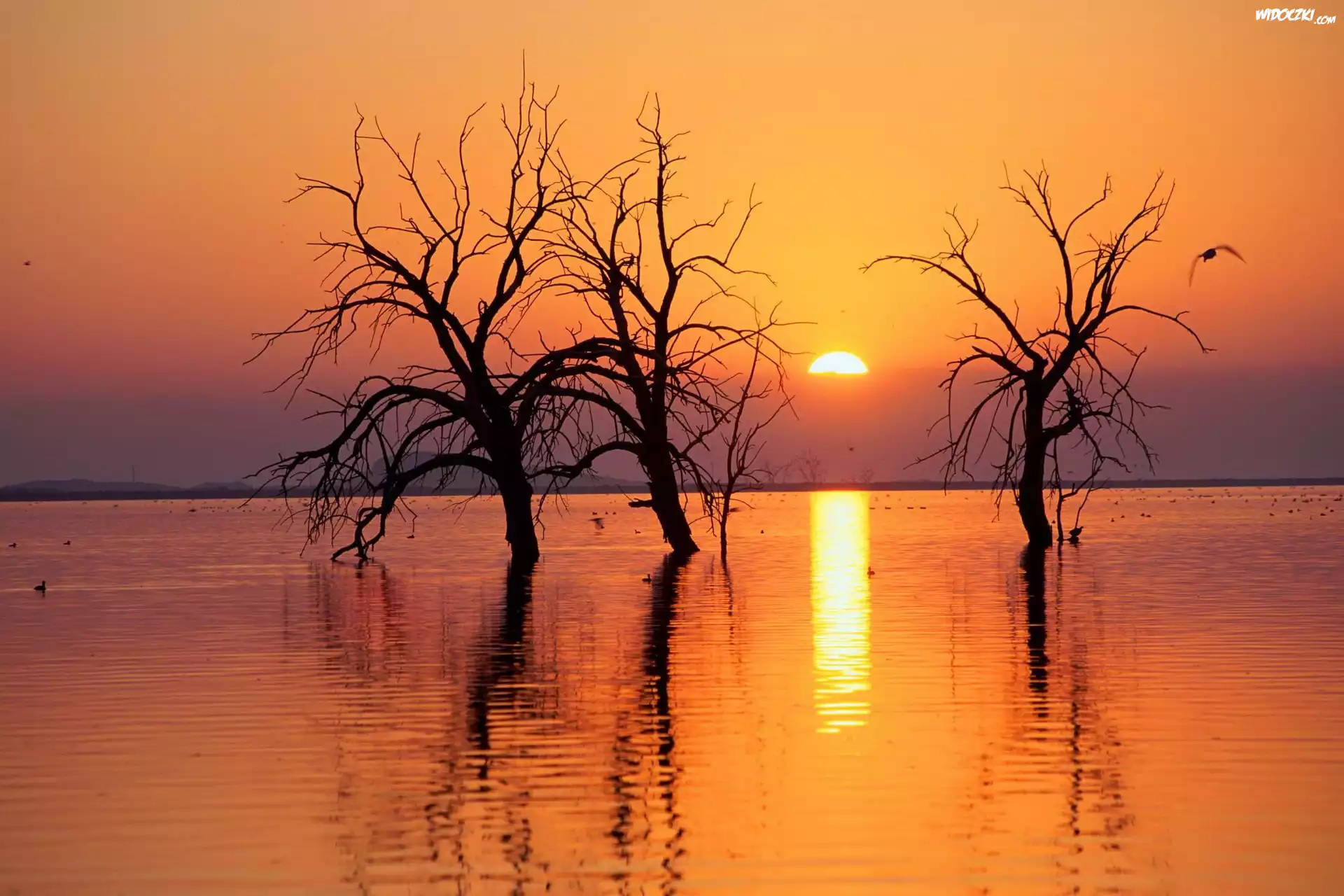 Zachód, Słońca, Jezioro, Trzy, Samotne, Suche, Drzewa