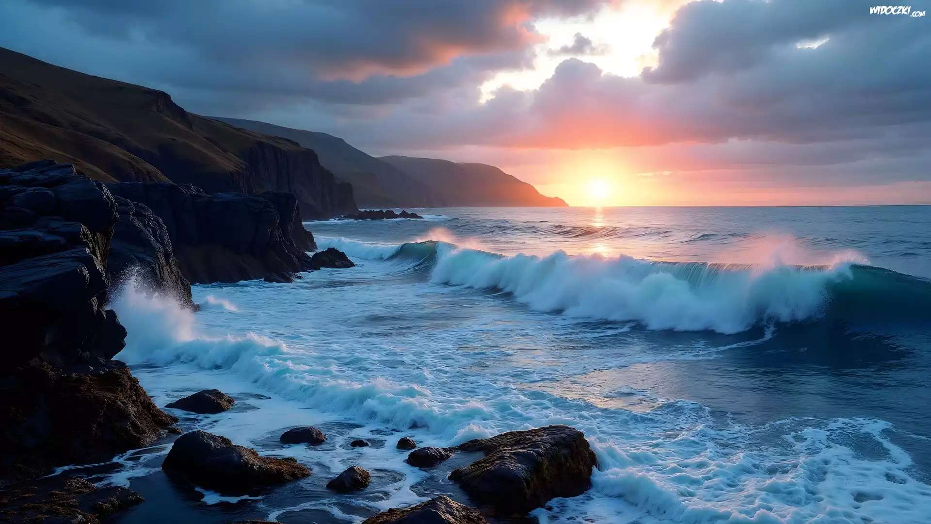 Zdjęcia, Morze, Fale, Zachód słońca, Skały, Klify, AI