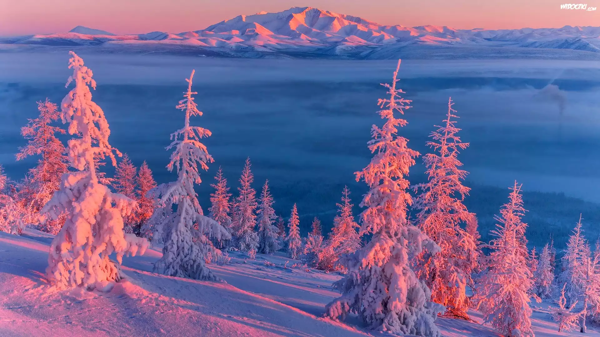 Zdjęcia, Zima, Góry, Zachód słońca, Ośnieżone, Drzewa, Mgła