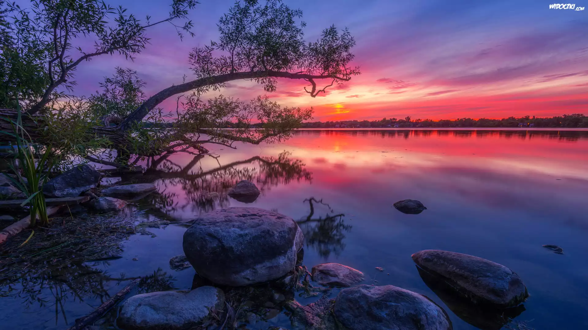 Zdjęcia, Zachód słońca, Jezioro, Kamienie, Pochyłe, Drzewo, Konary