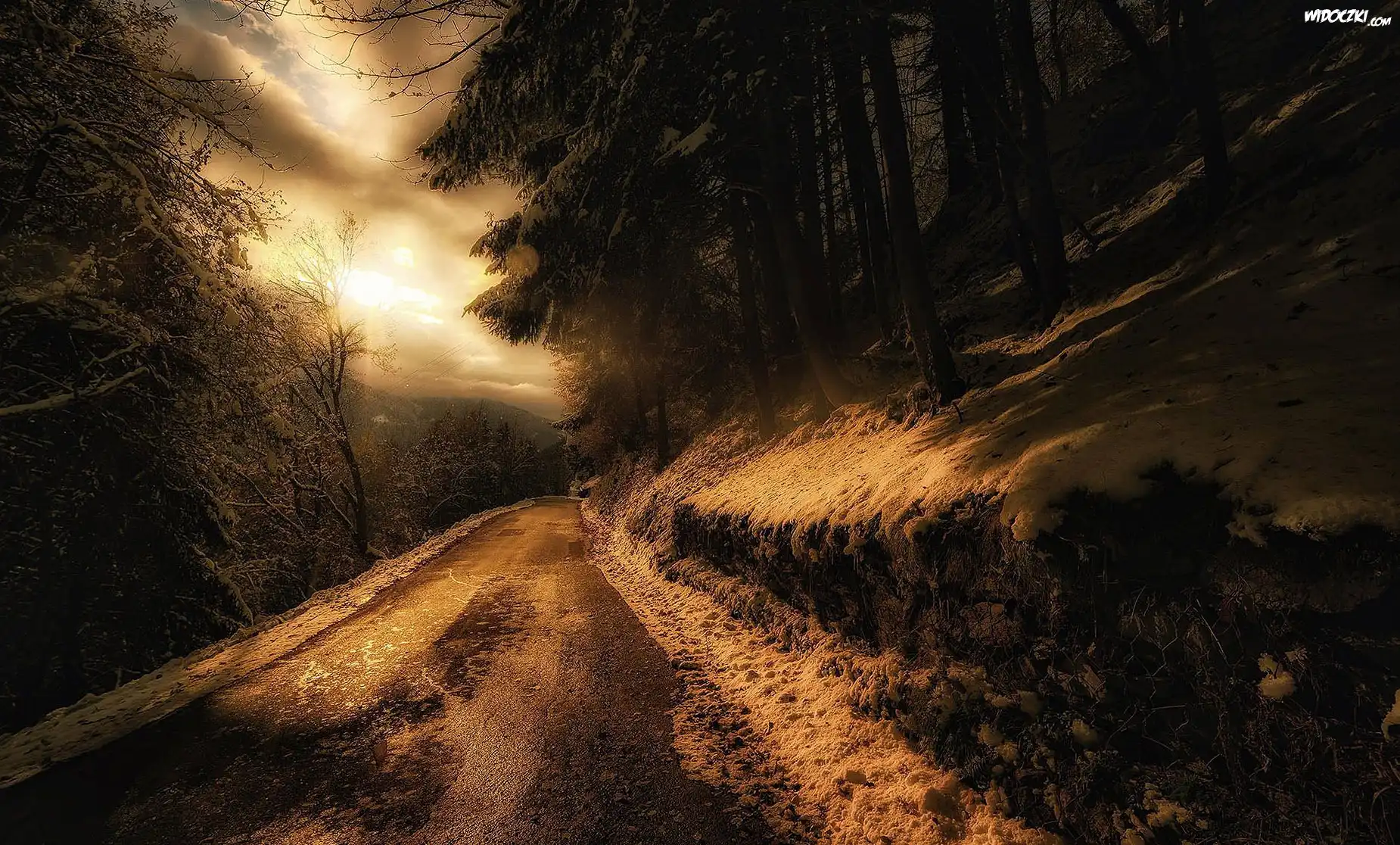 Zdjęcia, Zachód, Słońca, Droga, Skarpa, Drzewa, Zima, Śnieg