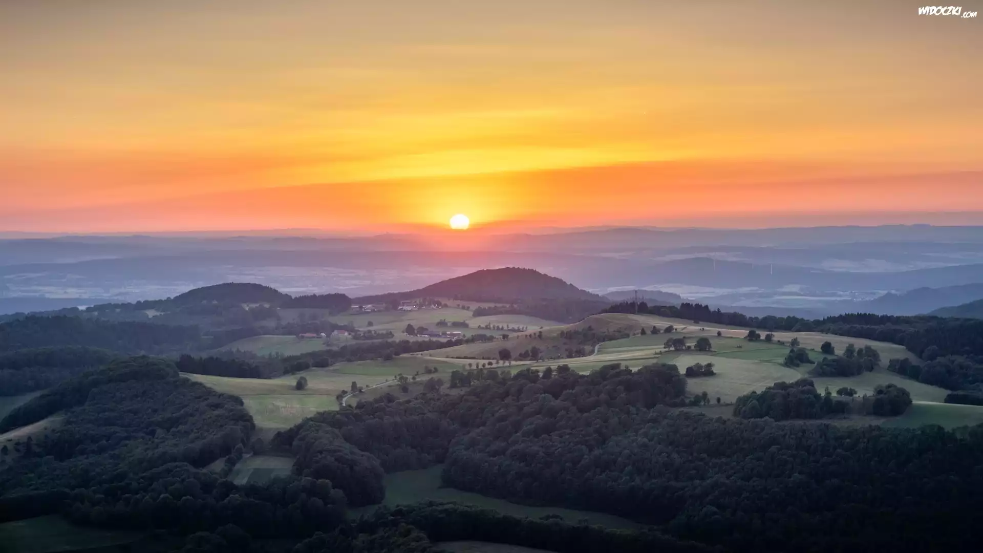 Zdjęcia, Zachód słońca, Góry Rhon, Wzgórza, Lasy, Niemcy