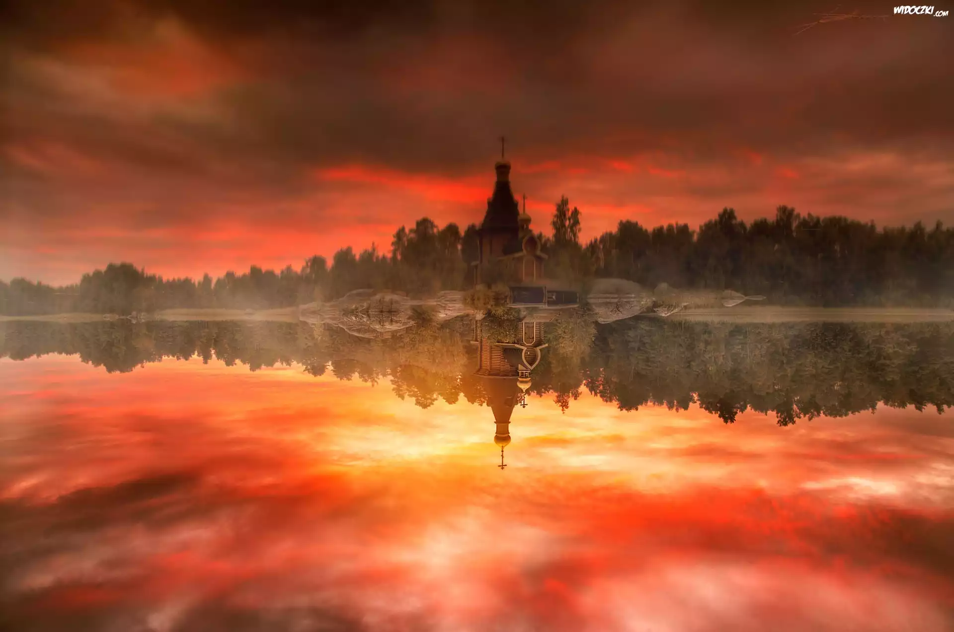 Zachód, Słońca, Jezioro, Cerkiew, Drzewa, Mgła, Odbicie
