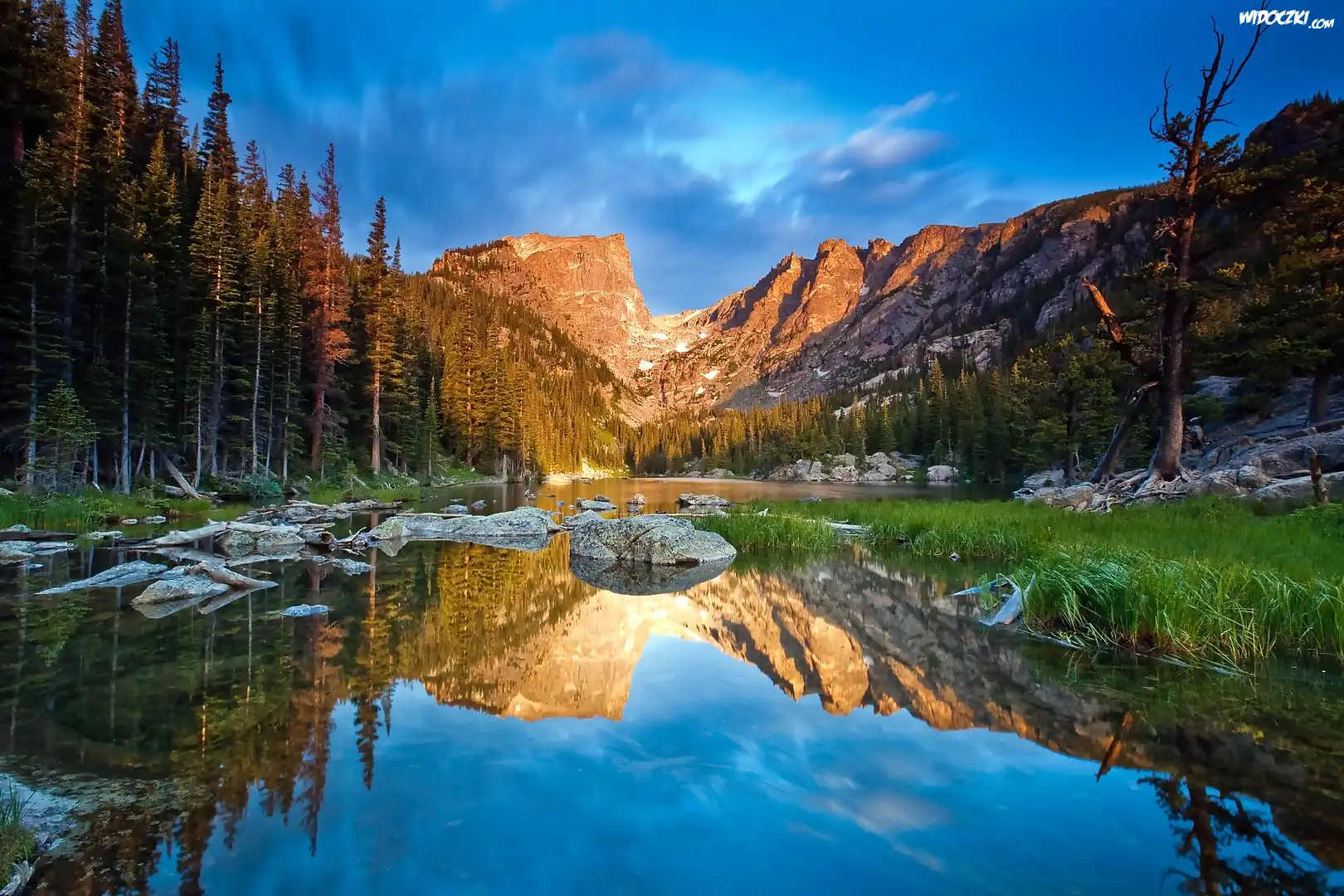 Zachód, Słońca, Góry, Jezioro, Głazy, Las, Odbicie