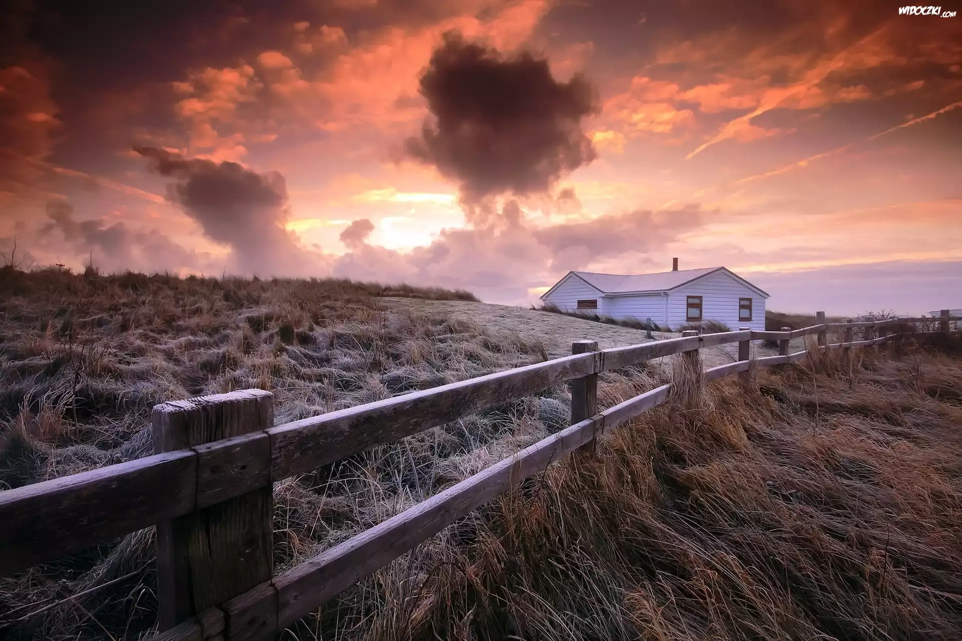 Zachód słońca, Chmury, Dom, Łąka, Szron, Ogrodzenie