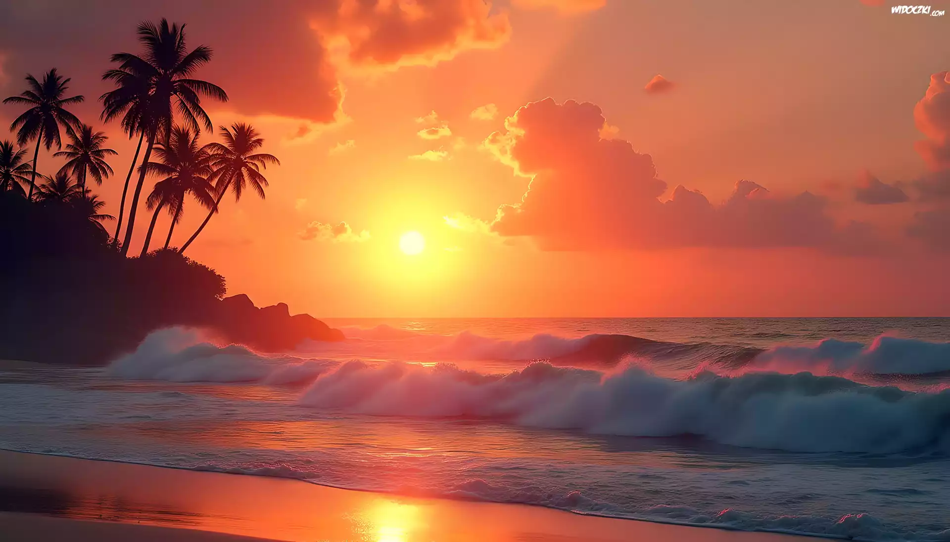 Zdjęcia, Morze, Palmy, Zachód słońca, Niebo, Fale, Grafika