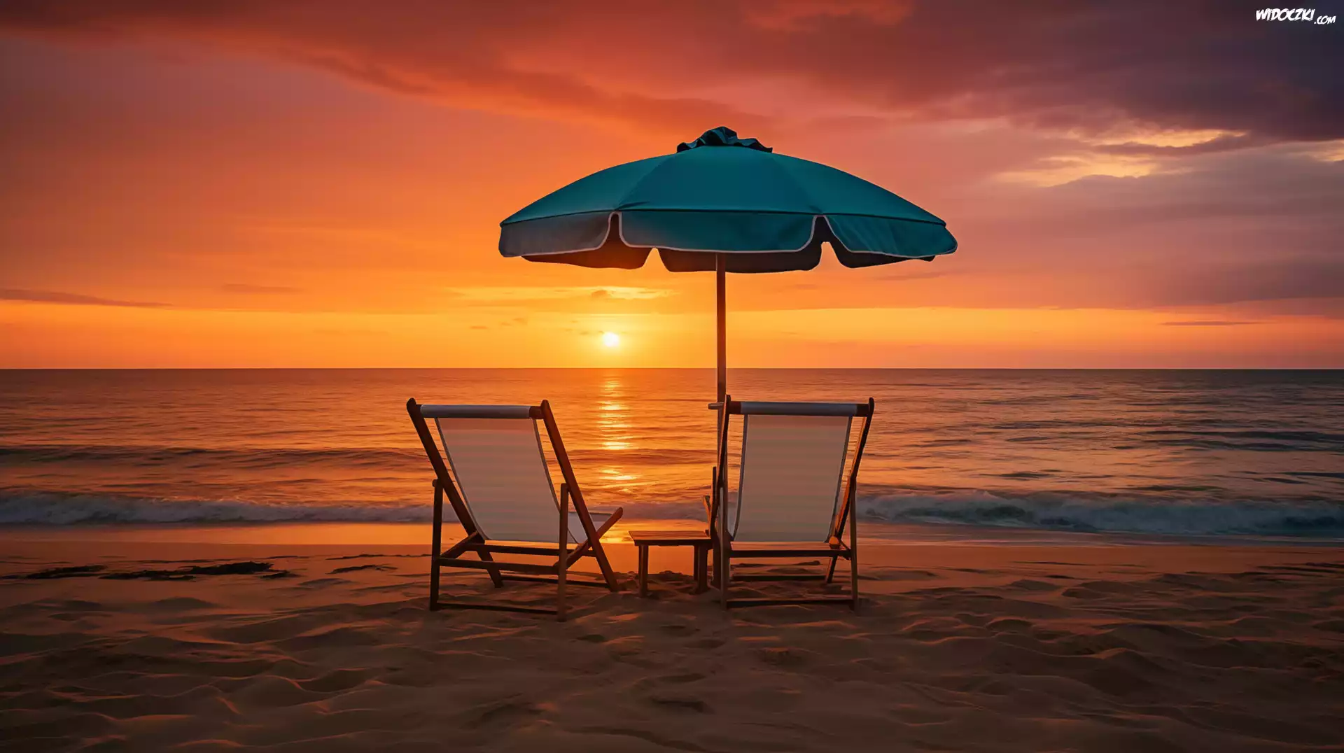 Zdjęcia, Morze, Plaża, Zachód słońca, Leżaki, Parasol, Grafika