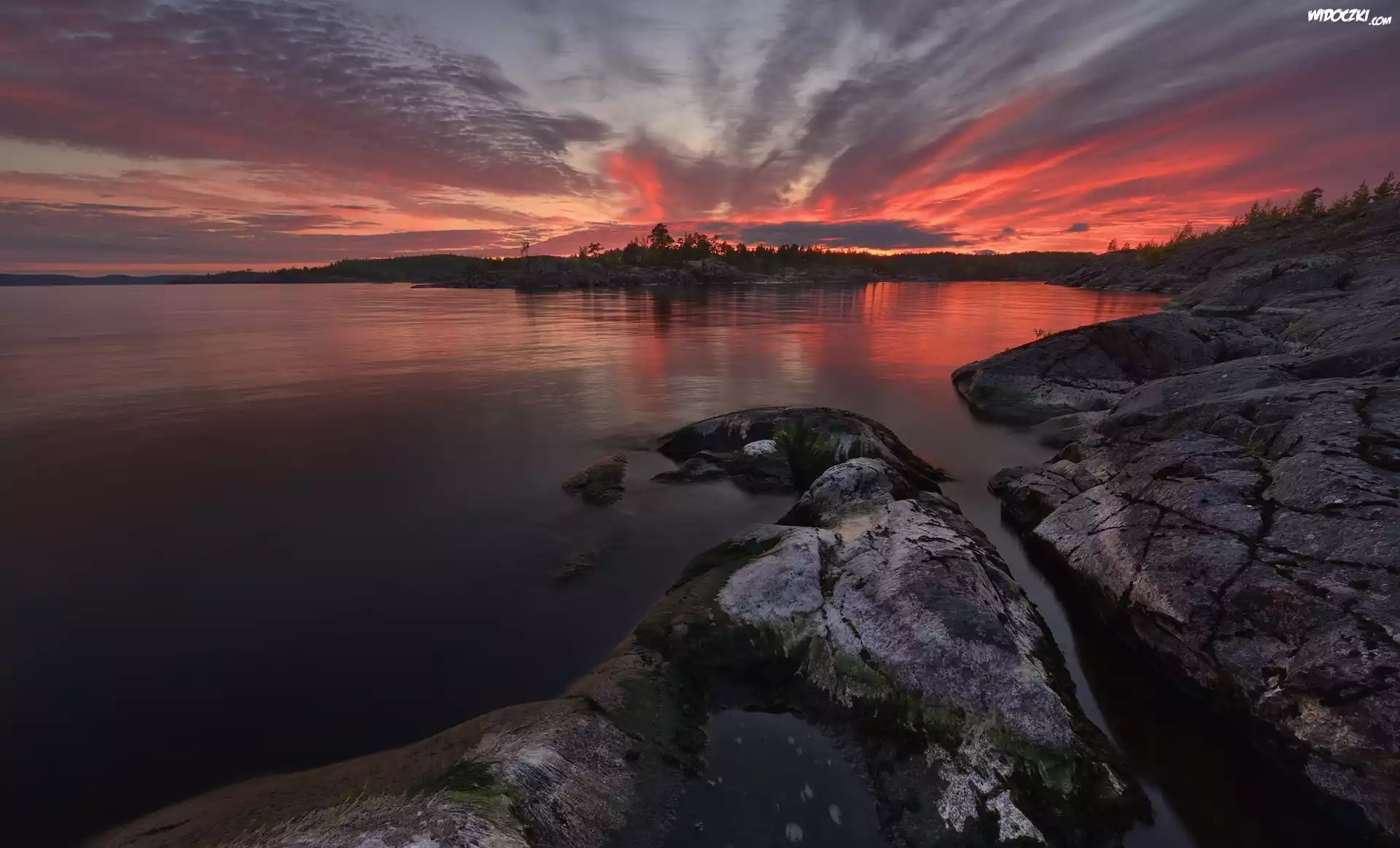 Zachód słońca, Jezioro Ładoga, Skały, Drzewa, Rosja