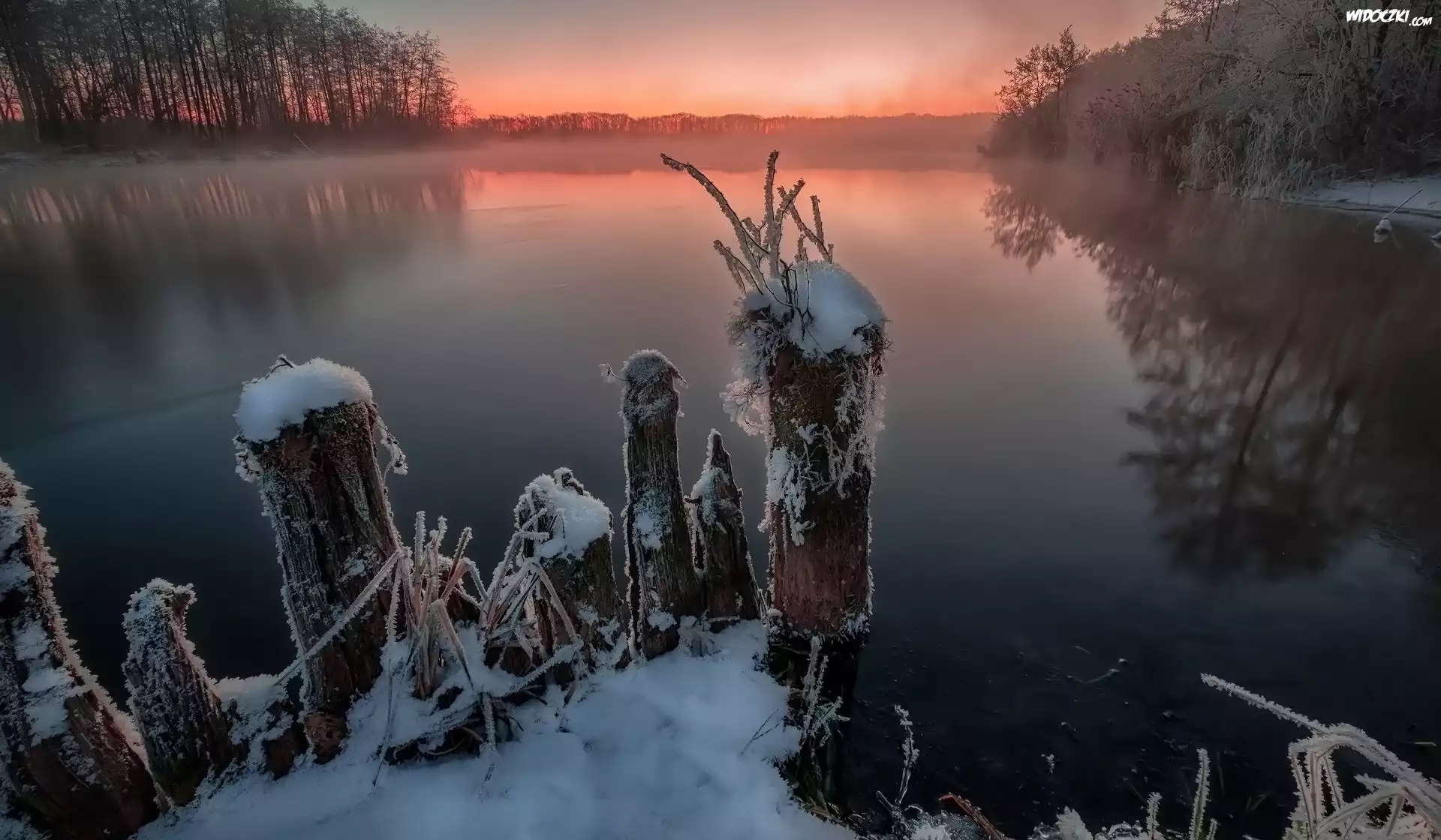 Zima, Jezioro Białe, Drzewa, Zachód słońca, Kołki, Miejscowość Szatura, Obwód moskiewski, Rosja |