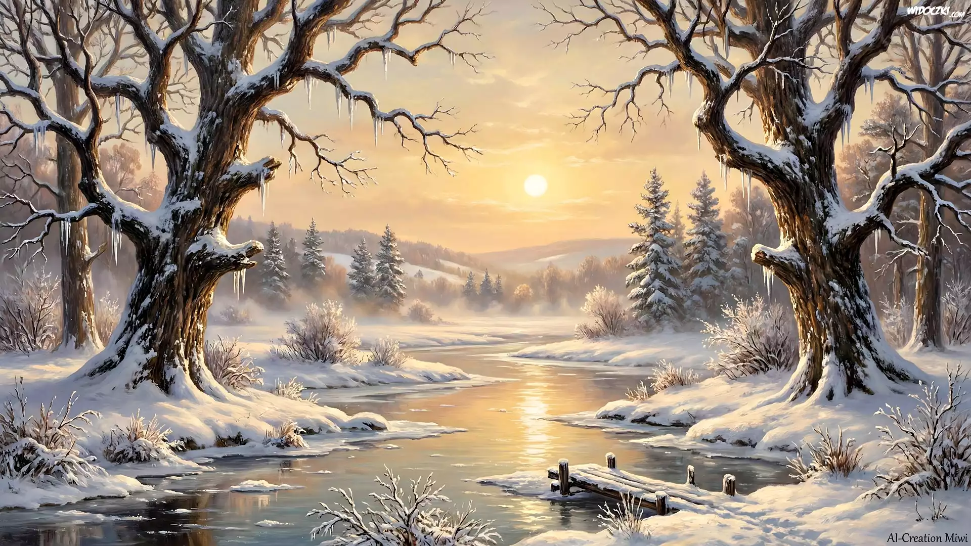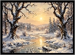 Zima, Rzeka, Drzewa, Słońce, Grafika, AI