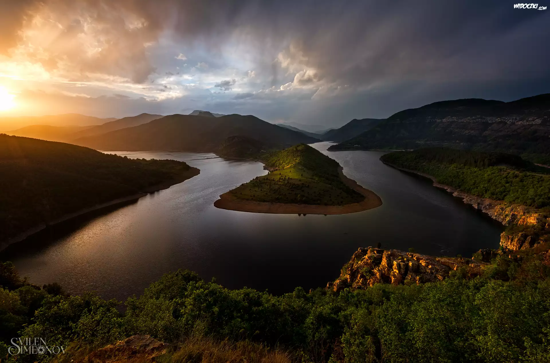 Bułgaria, Rzeka Arda, Meander, Zakola, Góry Rodopy, Chmury, Słońce