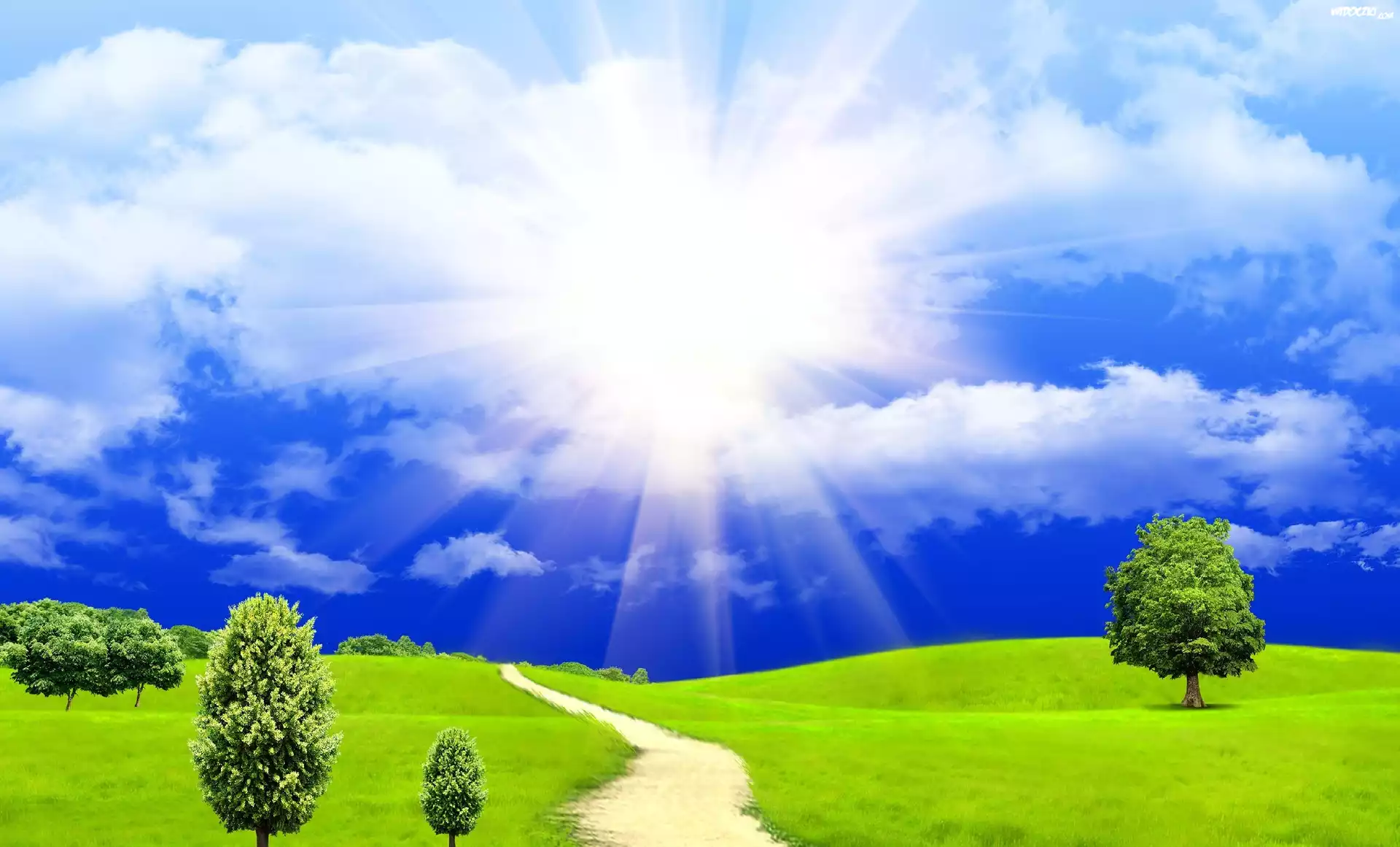 Słońce, Chmury, Łąka, Drzewa, Droga