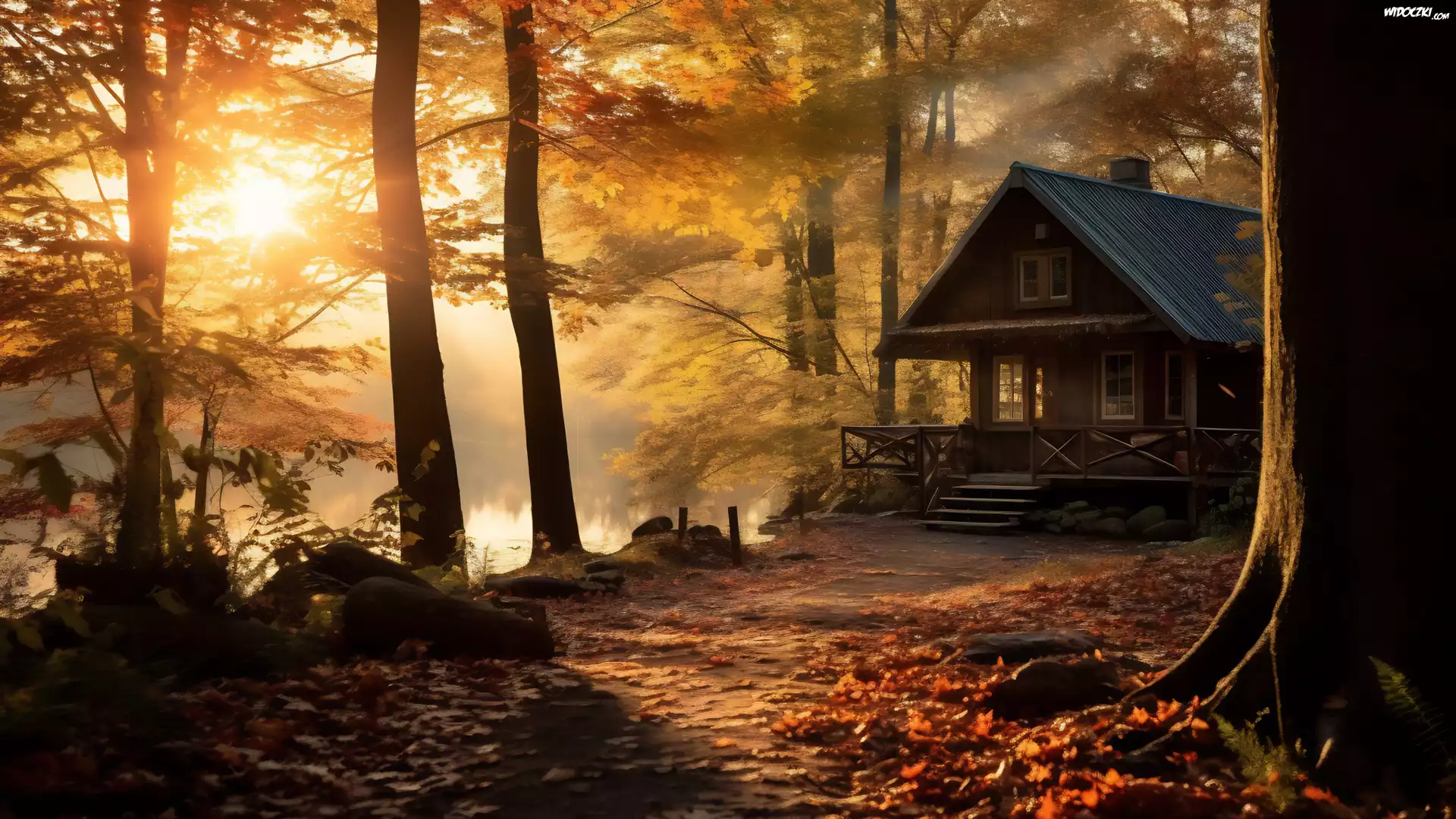 Jesień, Las, Drzewa, Dom, Liście, Staw, Mgła, Słońce