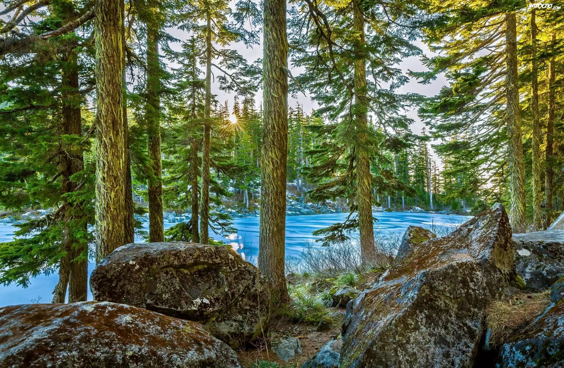 Zdjęcia, Stany Zjednoczone, Stan Waszyngton, Jezioro Mason Lake, Kamienie, Drzewa, Słońce