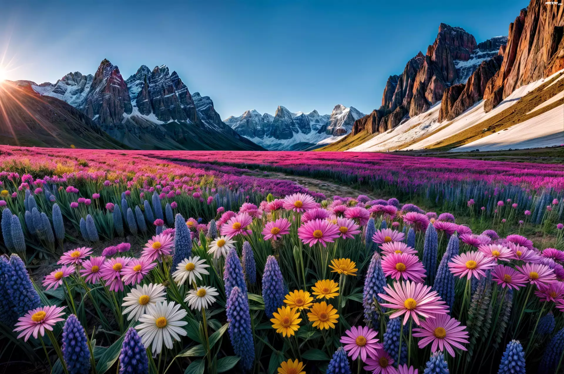 Kwiaty, Polana, Góry, Słońce, Grafika, Łąka