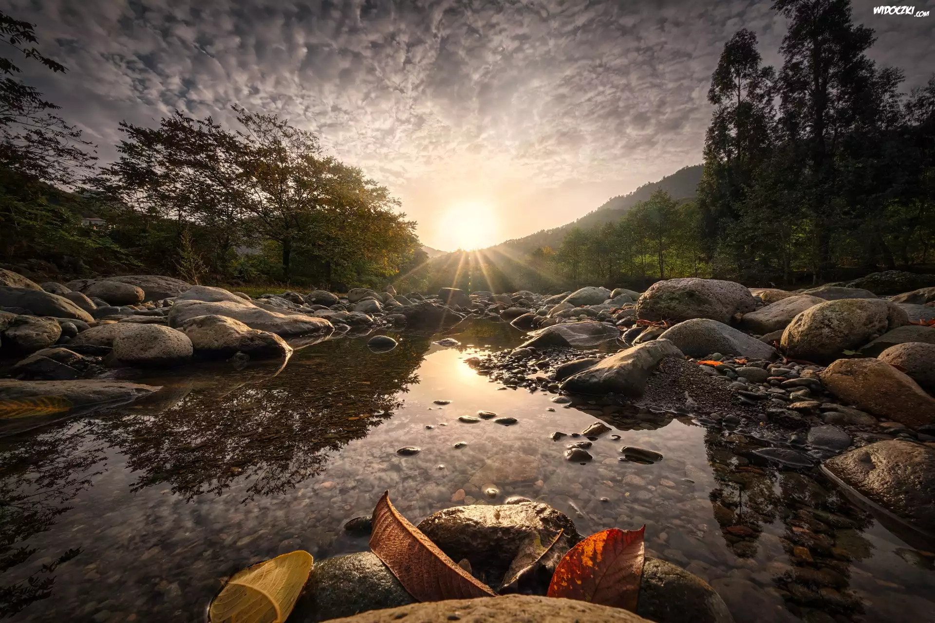 Zdjęcia, Rzeka, Kamienie, Drzewa, Słońce