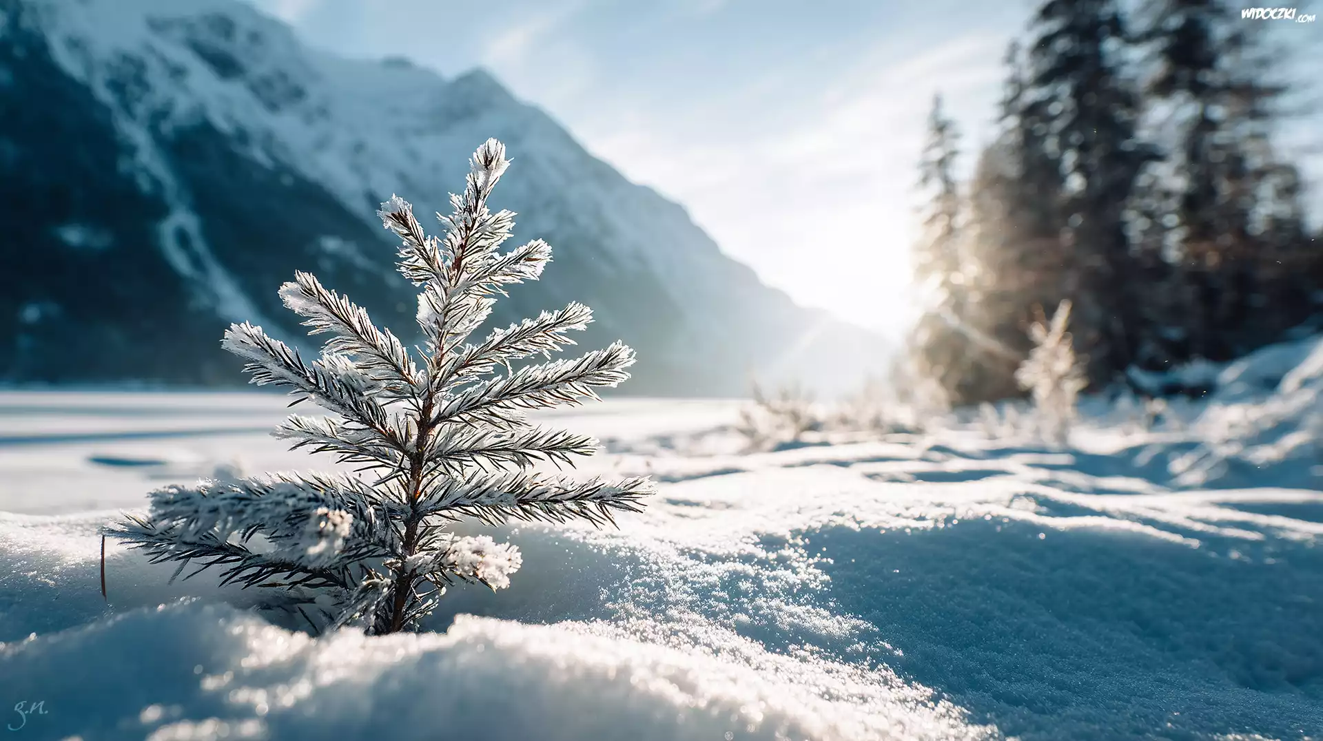 Zdjęcia, Iglasta, Gałązka, Śnieg, Słońce, Zima, Grafika AI