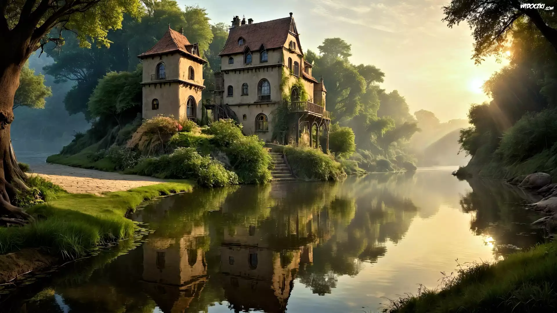 Zdjęcia, Grafika, Rzeka, Dom, Słoneczne światło, Drzewa, Odbicie