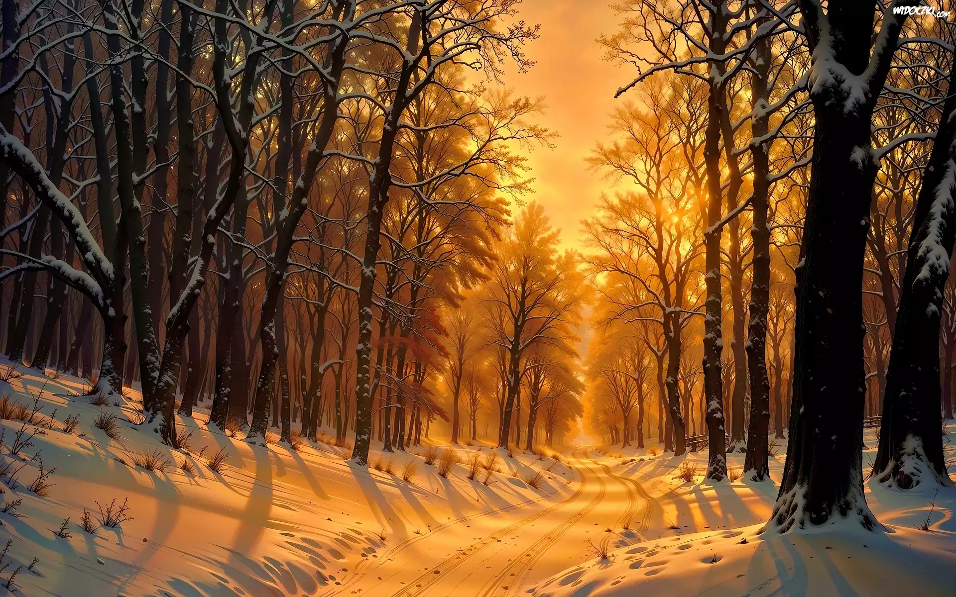 Las, Zima, Drzewa, Słoneczne, Światło, Droga