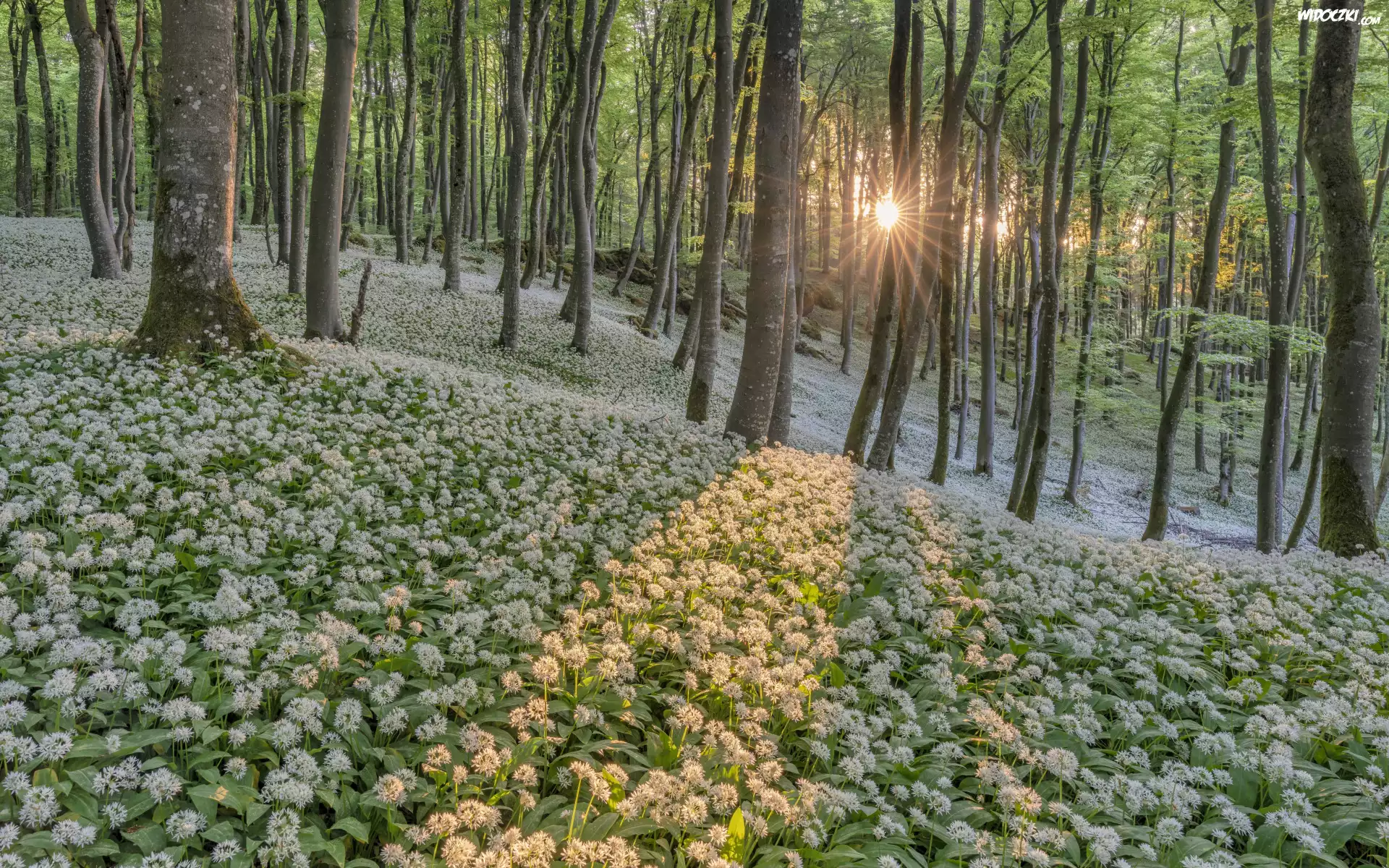 Zdjęcia, Wiosna, Las, Drzewa, Kwiaty, Czosnek niedżwiedzi, Promienie słoneczne