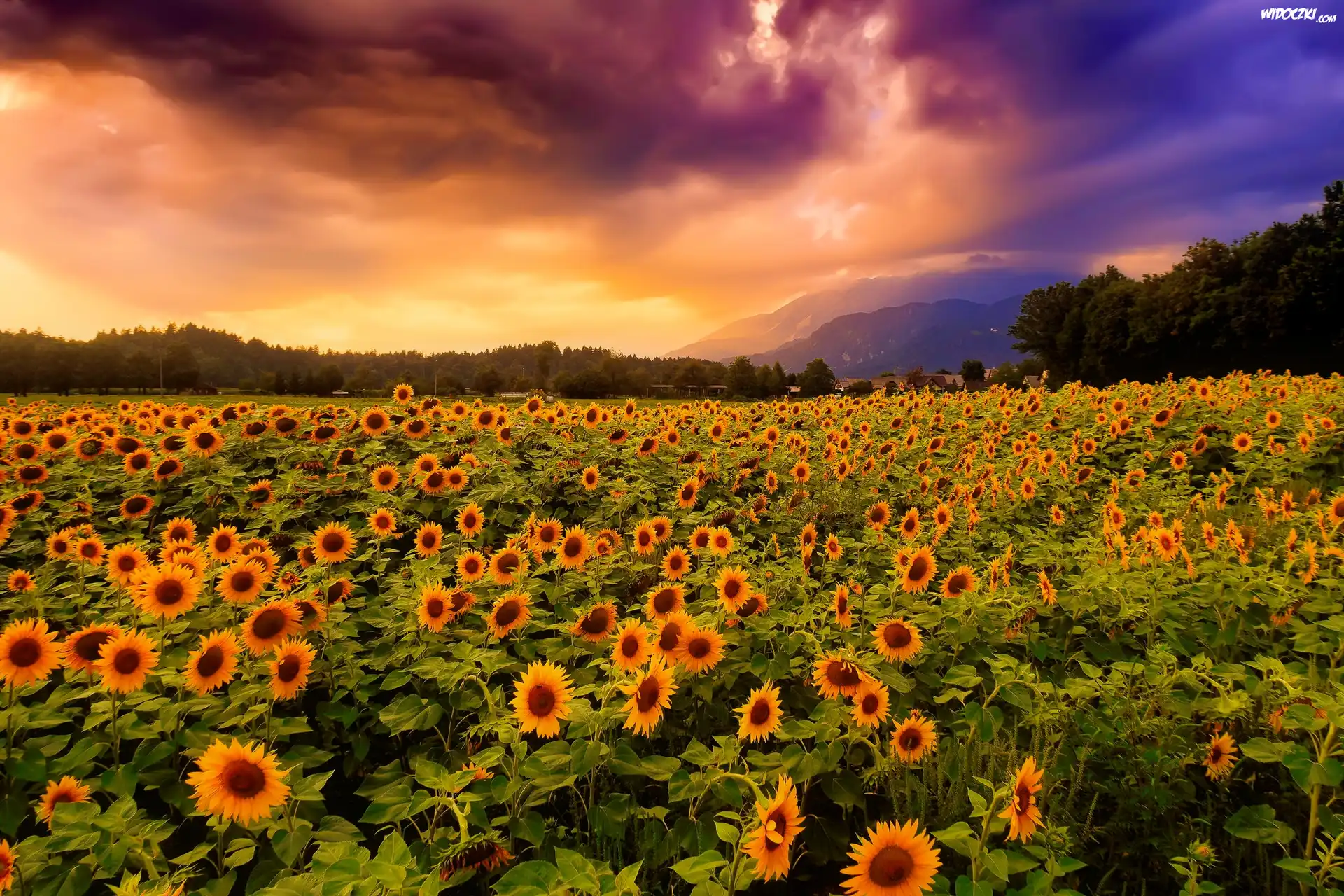 Zdjęcia, Słoneczniki, Chmury, Zachód słońca, Drzewa