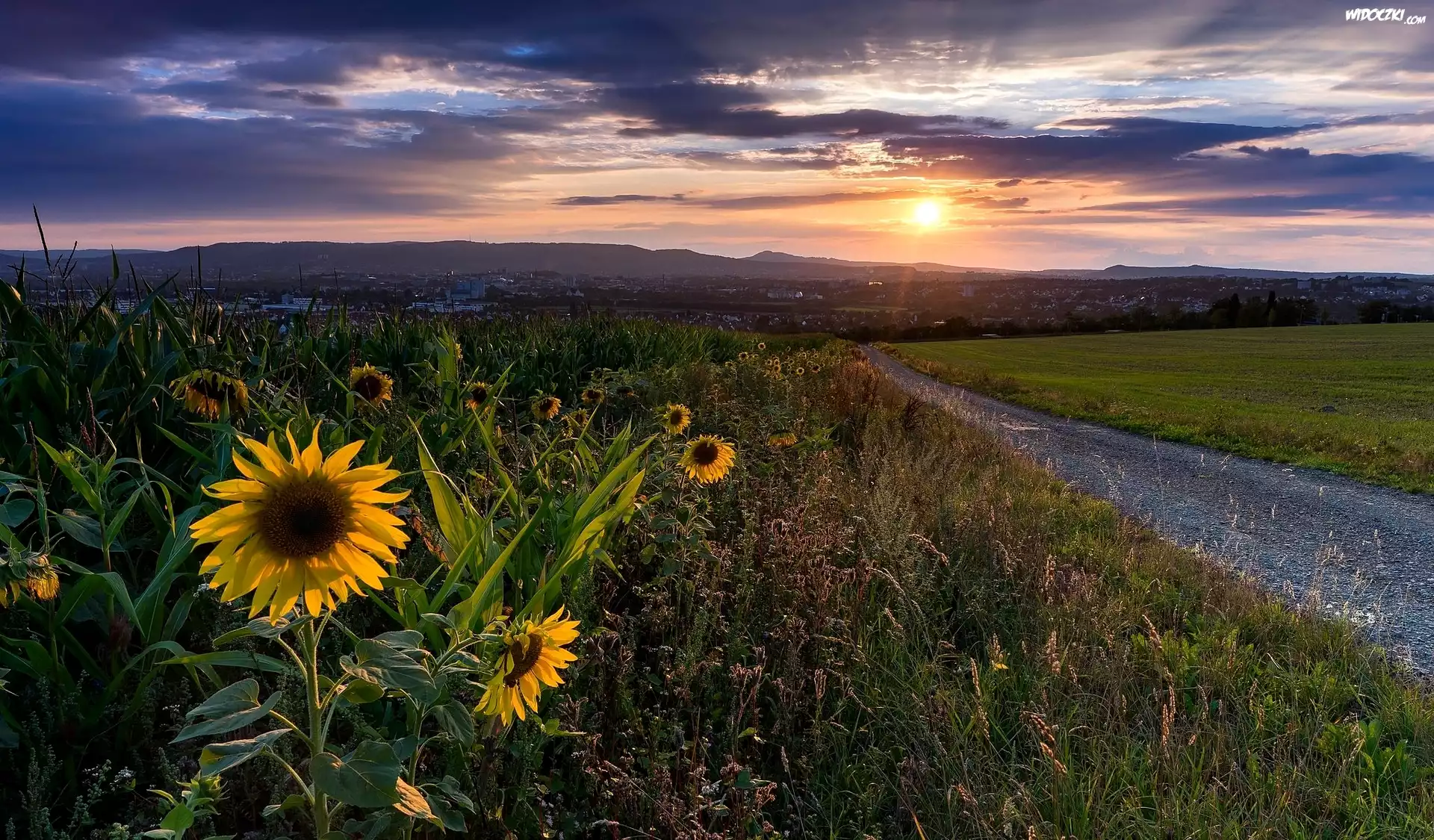 Zdjęcia, Słoneczniki, Pole, Droga, Słońce, Chmury