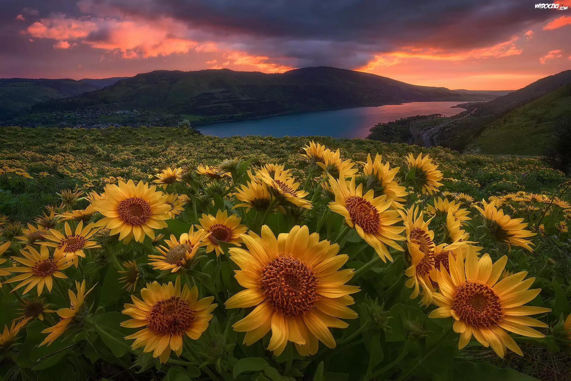 Zdjęcia, Słoneczniki, Jezioro, Góry, Zachód, Słońca