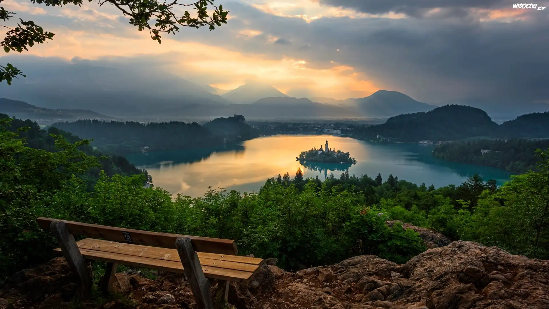 Słowenia, Wyspa Blejski Otok, Góry Alpy Julijskie, Jezioro Bled, Ławka, Las, Wschód słońca, Chmury, Drzewa |