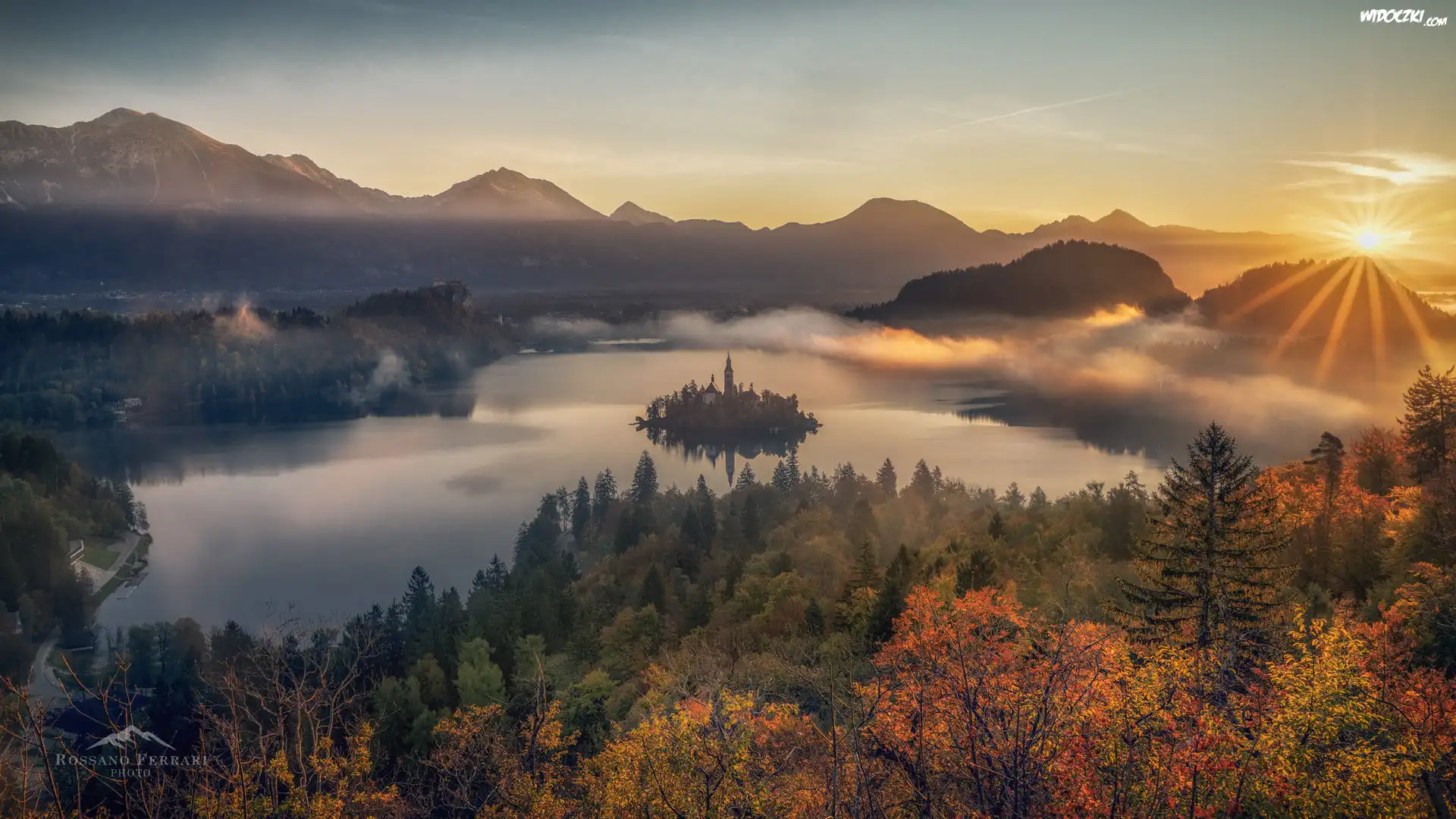 Słowenia, Wyspa Blejski Otok, Góry Alpy Julijskie, Jezioro Bled, Promienie słońca, Chmury, Drzewa, Jesień, Mgła |