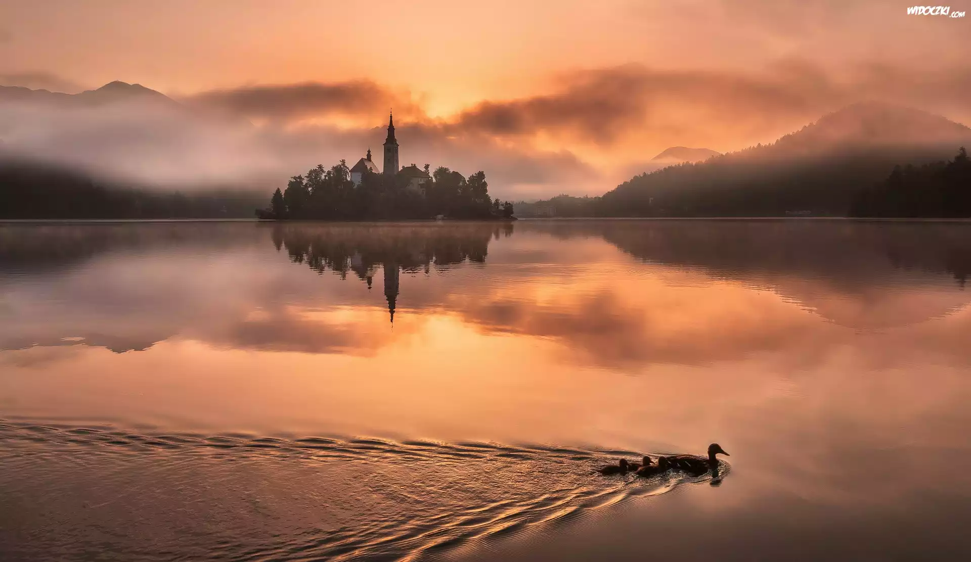 Słowenia, Jezioro Bled, Wyspa Blejski Otok, Kościół Zwiastowania Marii Panny, Góry Alpy Julijskie, Mgła, Kaczki, Odbicie |