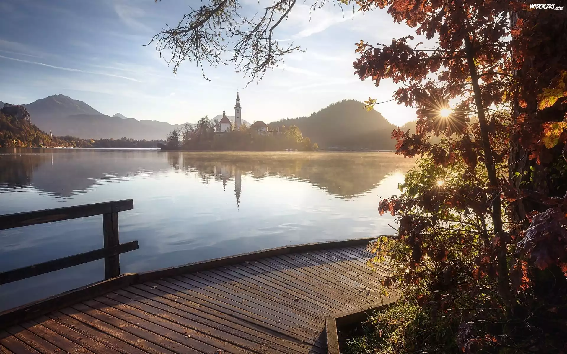 Słowenia, Jezioro Bled, Wyspa Blejski Otok, Kościół Zwiastowania Marii Panny, Góry Alpy Julijskie, Wschód Słońca, Pomost, Promienie słońca, Drzewa |