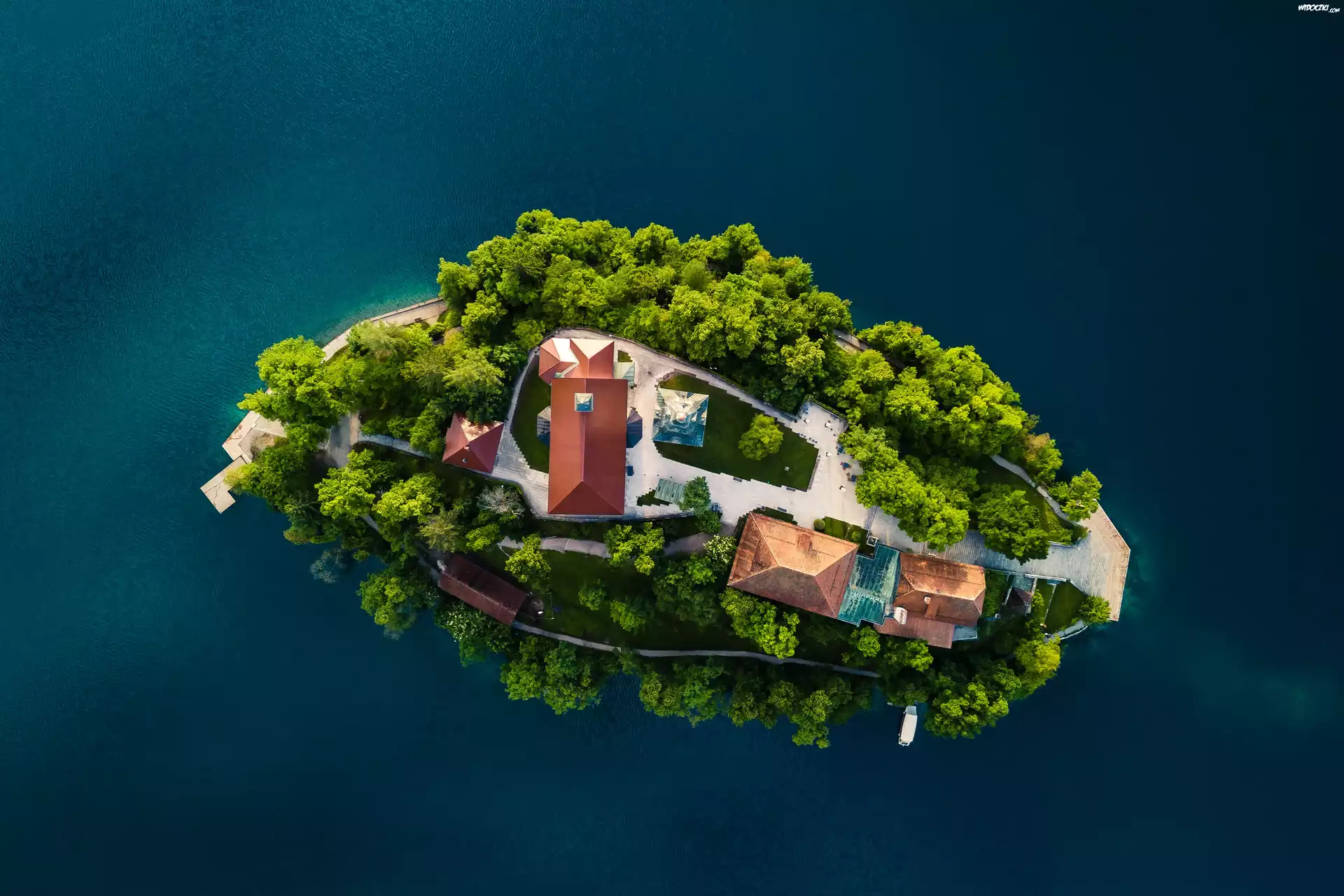 Zdjęcia, Słowenia, Jezioro Bled, Wyspa, Blejski Otok, Drzewa, Z lotu ptaka