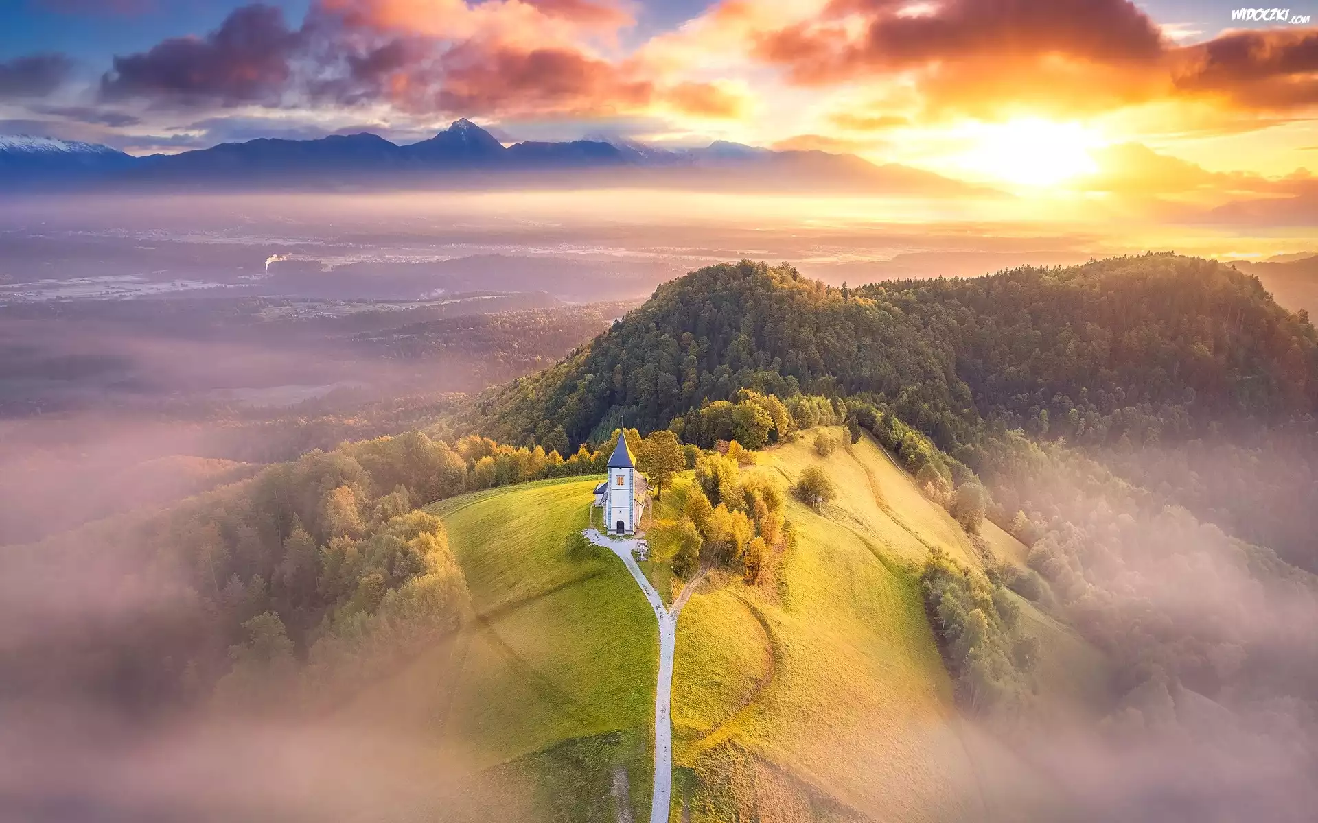 Kościół św Primusa i Felicjana, Wzgórze, Chmury, Mgła, Wschód słońca, Góry, Las, Drzewa, Jesień, Wieś Jamnik, Słowenia |