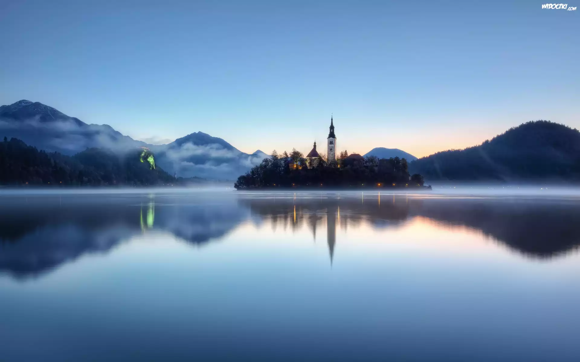 Słowenia, Bled, Zamek, Jezioro, Mgła, Góry