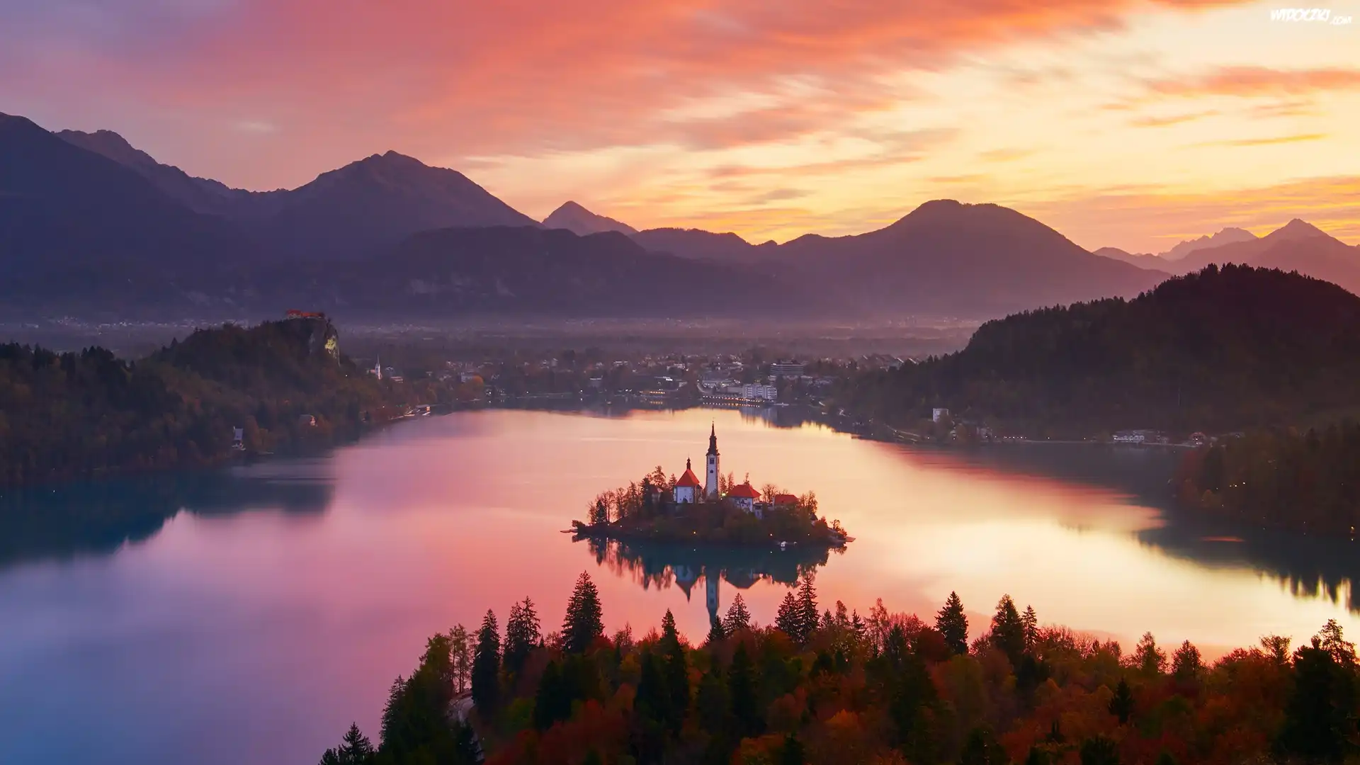 Słowenia, Wyspa, Blejski Otok, Góry, Alpy Julijskie, Jezioro Bled, Drzewa, Jesień, Zachód słońca
