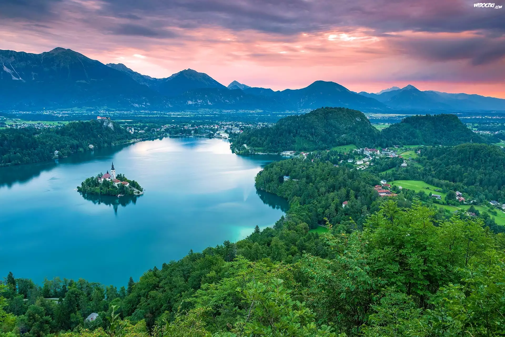 Zdjęcia, Słowenia, Wyspa Blejski Otok, Góry Alpy Julijskie, Jezioro Bled, Kościół, Zachód słońca, Drzewa
