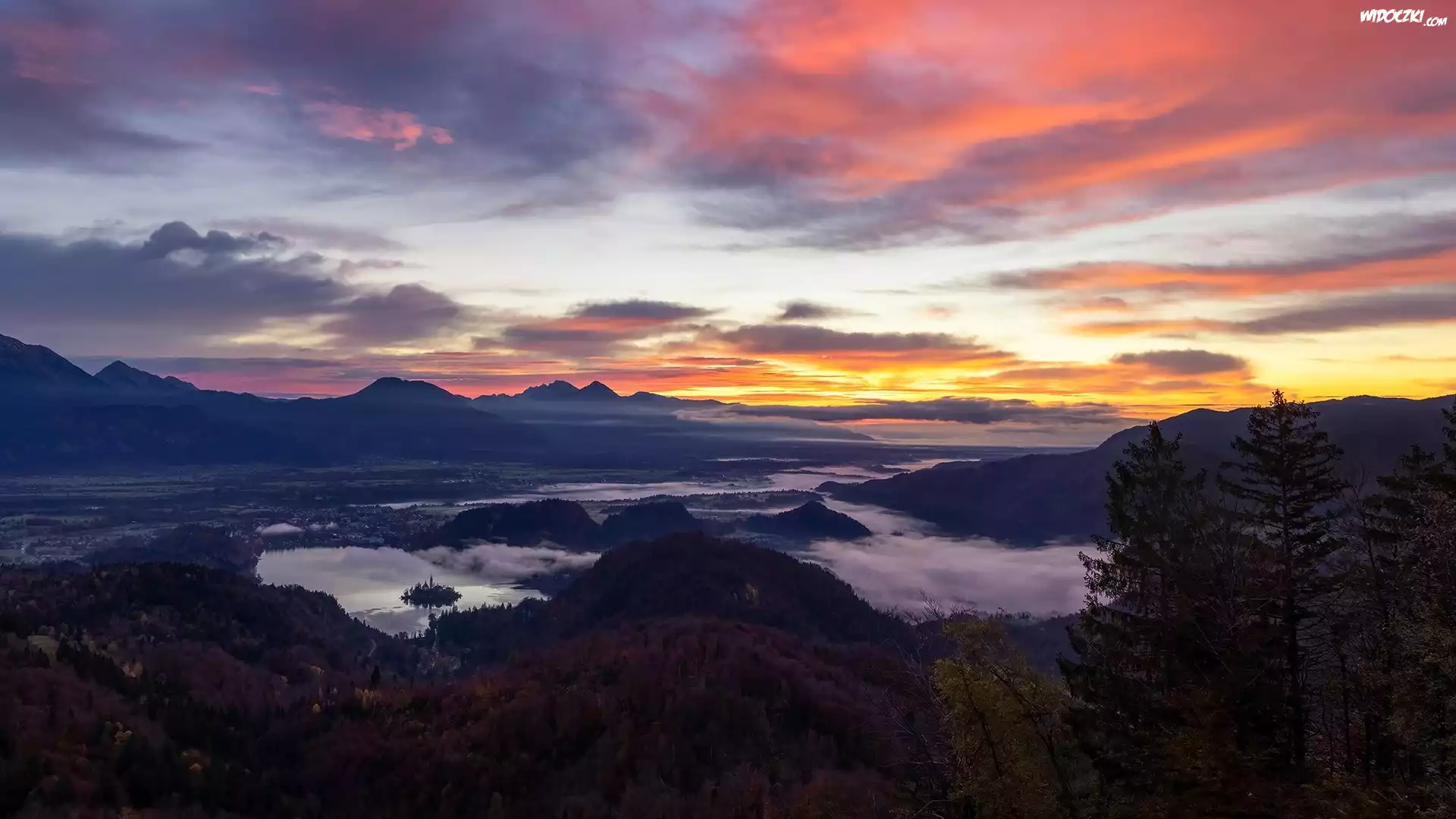 Słowenia, Jezioro Bled, Góry, Alpy Julijskie, Drzewa, Zachód słońca, Chmury